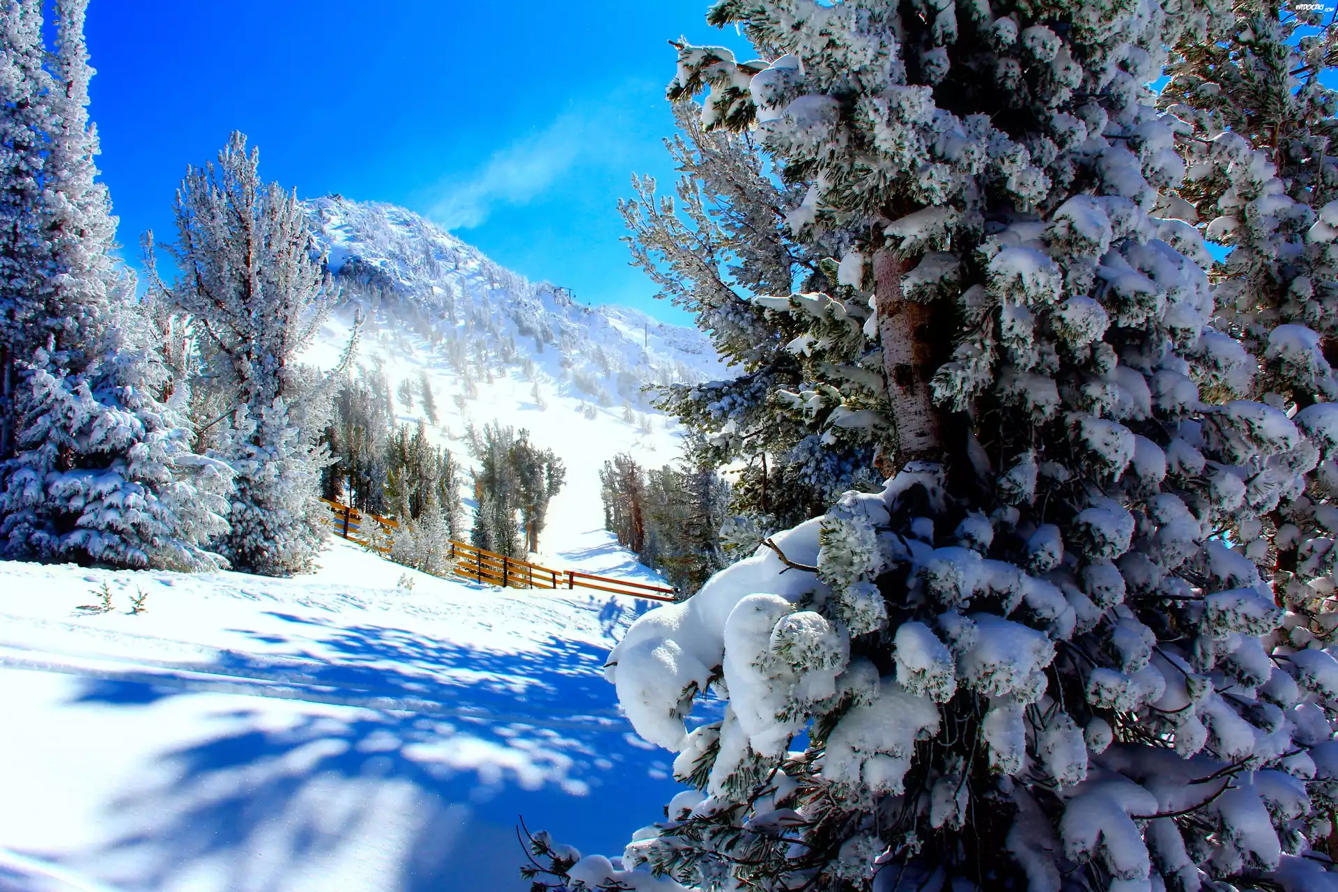 Góry, Lasy, Drzewa, Ogrodzenie, Zima