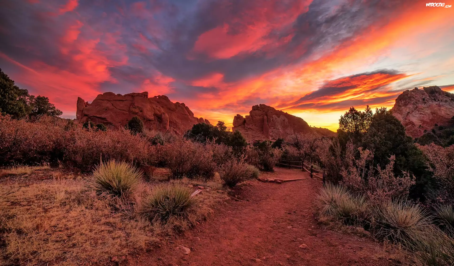 Stany Zjednoczone, Kolorado, Garden of the Gods, Góry, Skały, Drzewa, Krzewy, Ogrodzenie, Ścieżka, Wschód słońca |