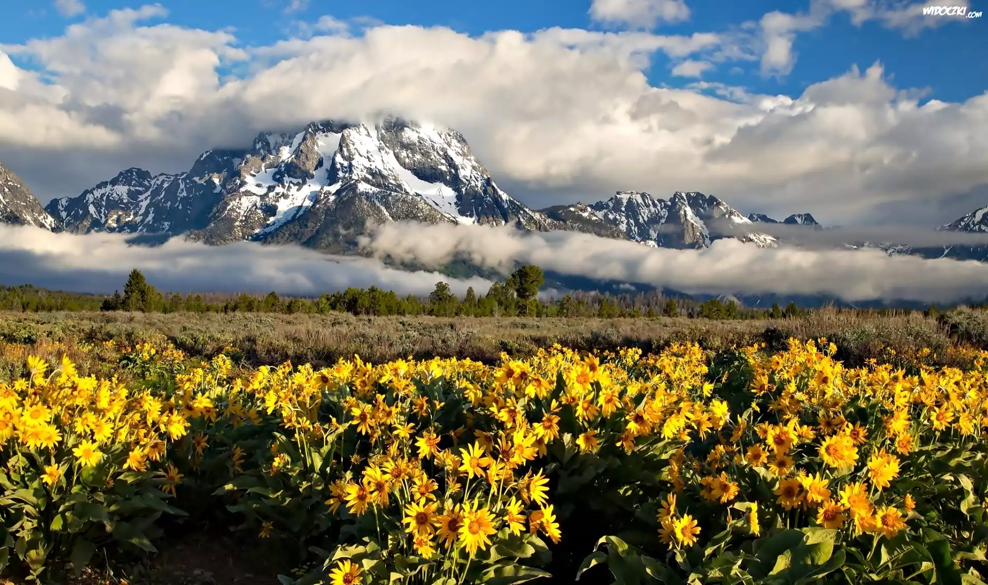 Góry, Niebo, Chmury, Żółte, Kwiaty