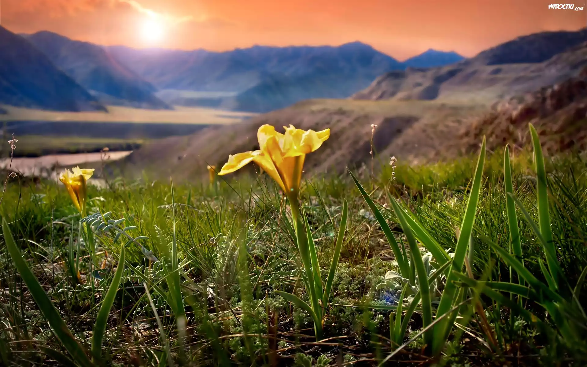 Zdjęcia, Góry, Zachód Słońca, Żółty, Kwiat