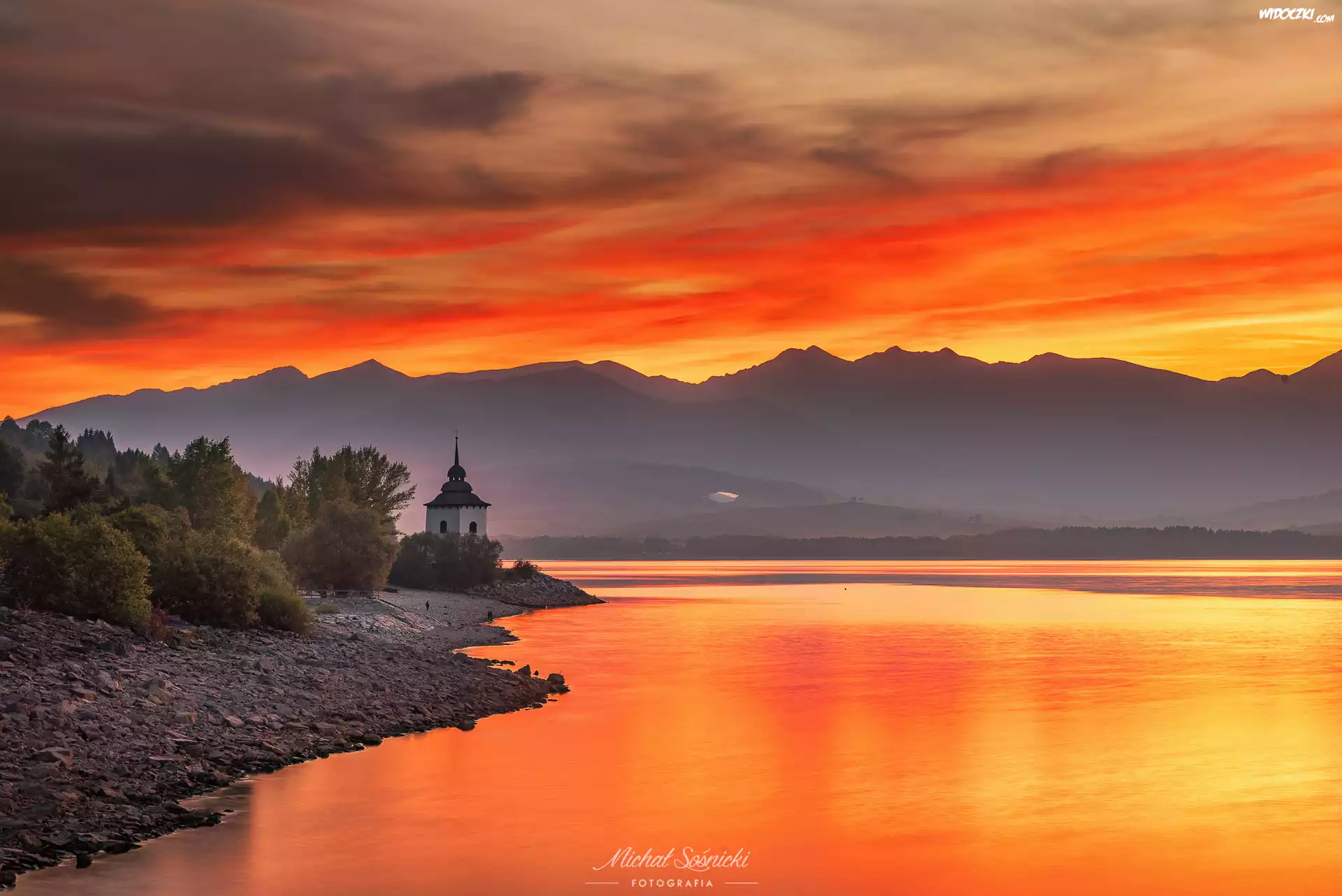 Zdjęcia, Słowacja, Jezioro Orawskie, Góry, Jezioro, Zachód słońca