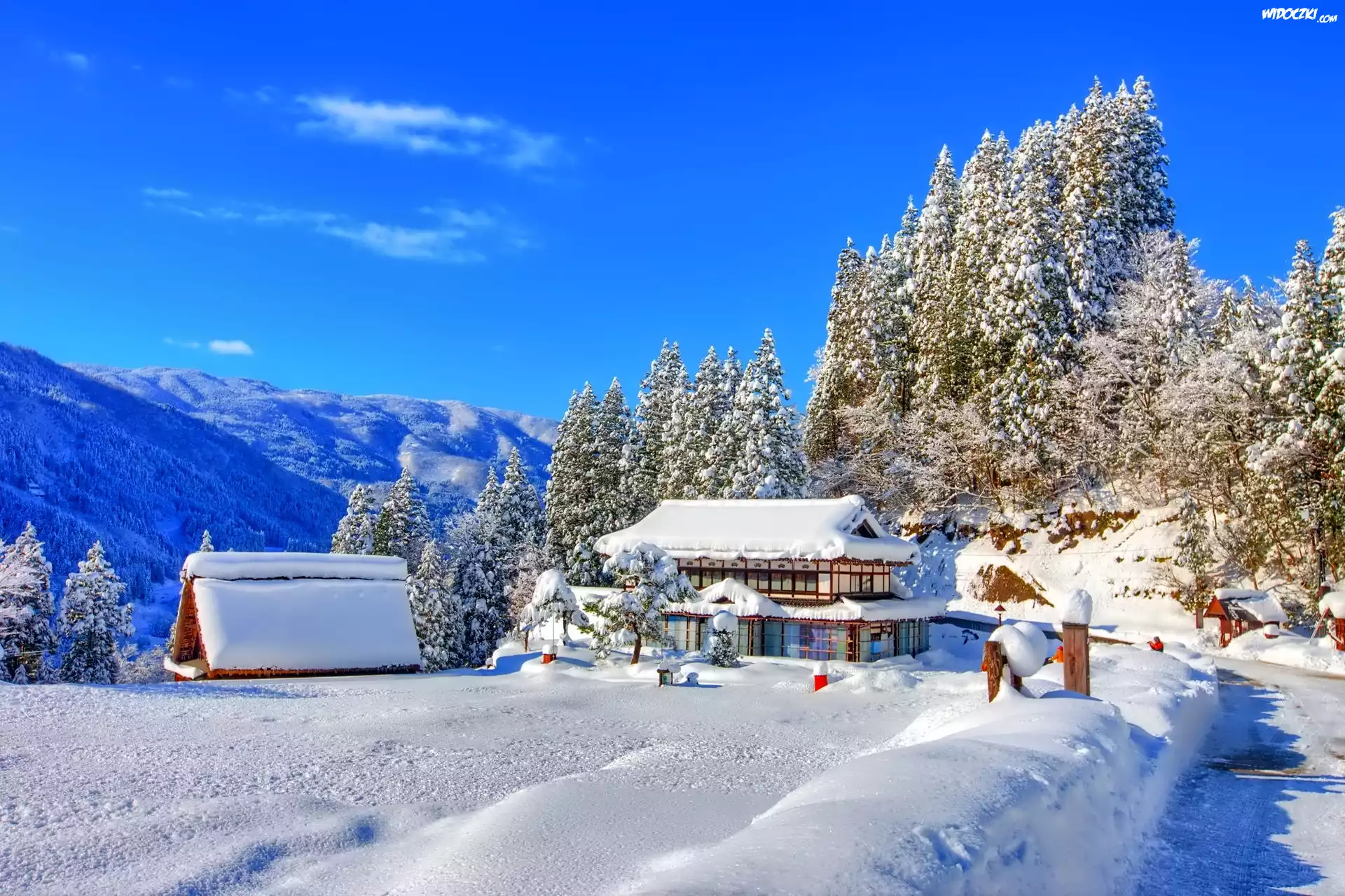 Zdjęcia, Góry, Zima, Droga, Ośnieżone, Domy
