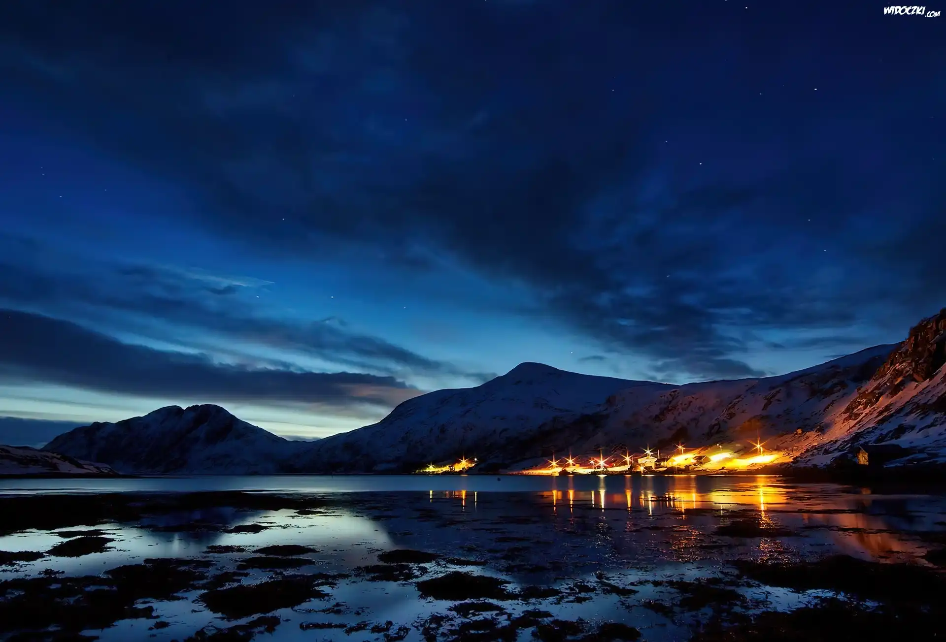 Zdjęcia, Góry, Morze, Oświetlona, Osada