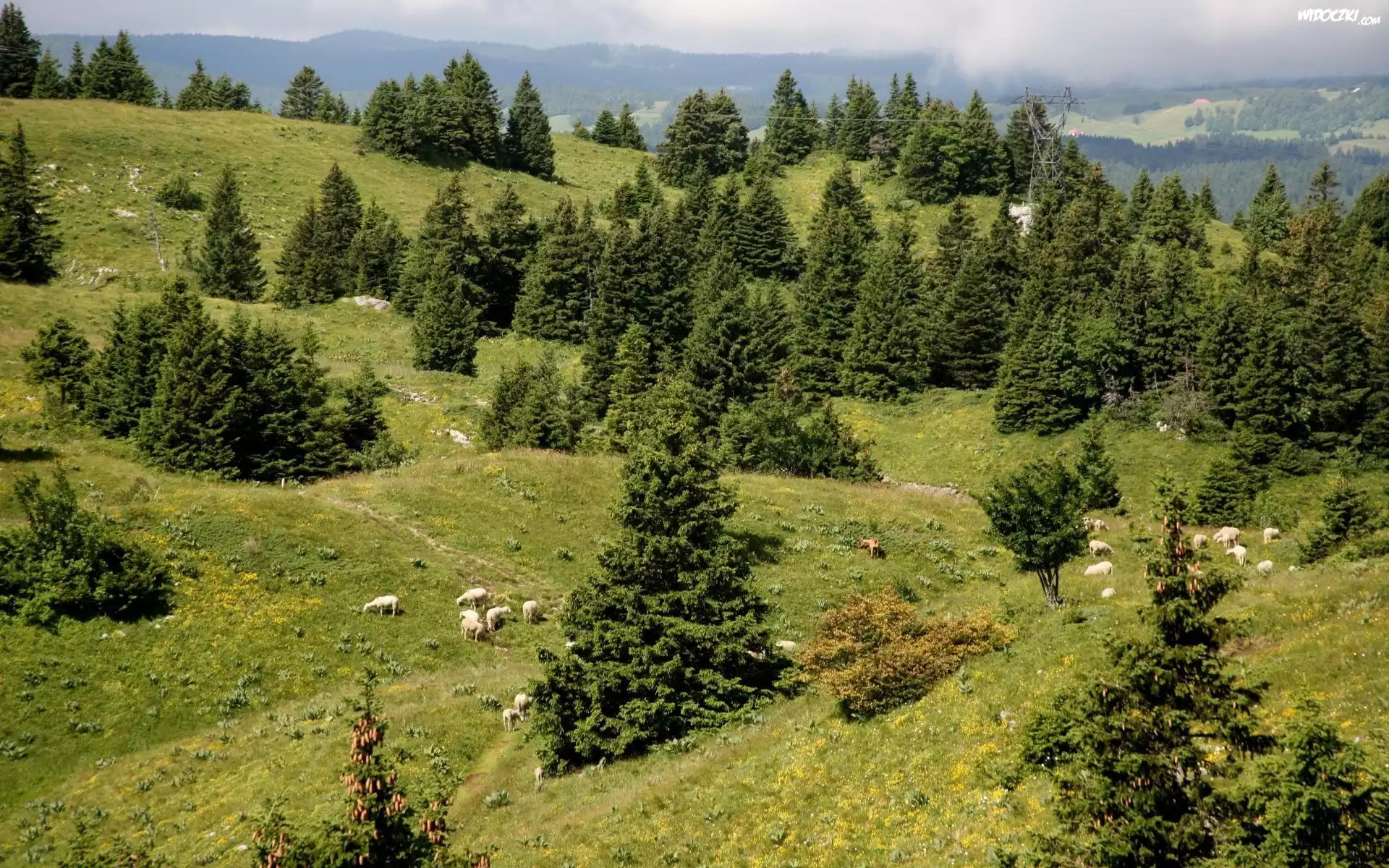 Góry, Hale, Owce, Drzewa, Wzgórza