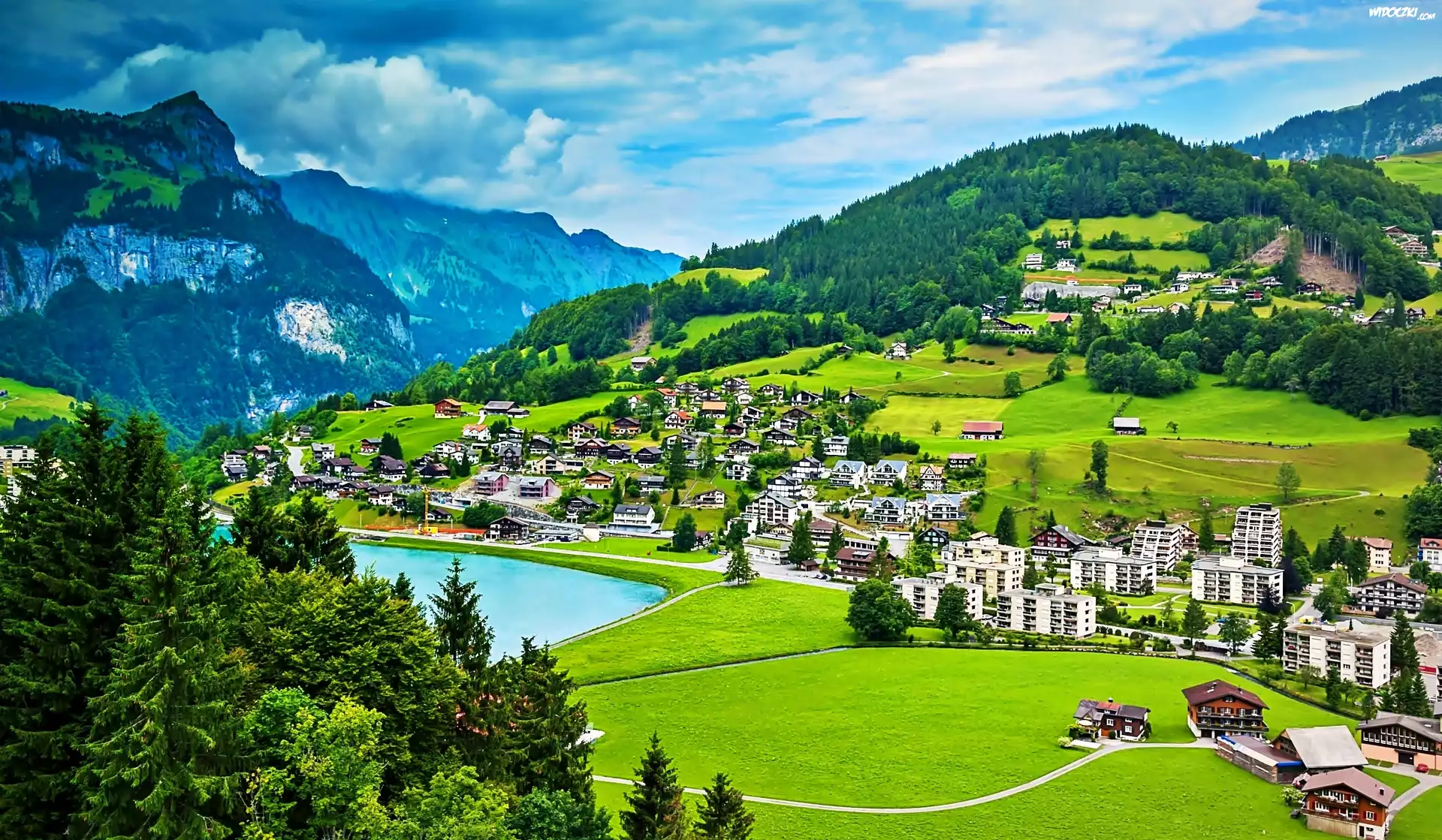 Zdjęcia, Góry, Lasy, Jezioro, Panorama, Miasta