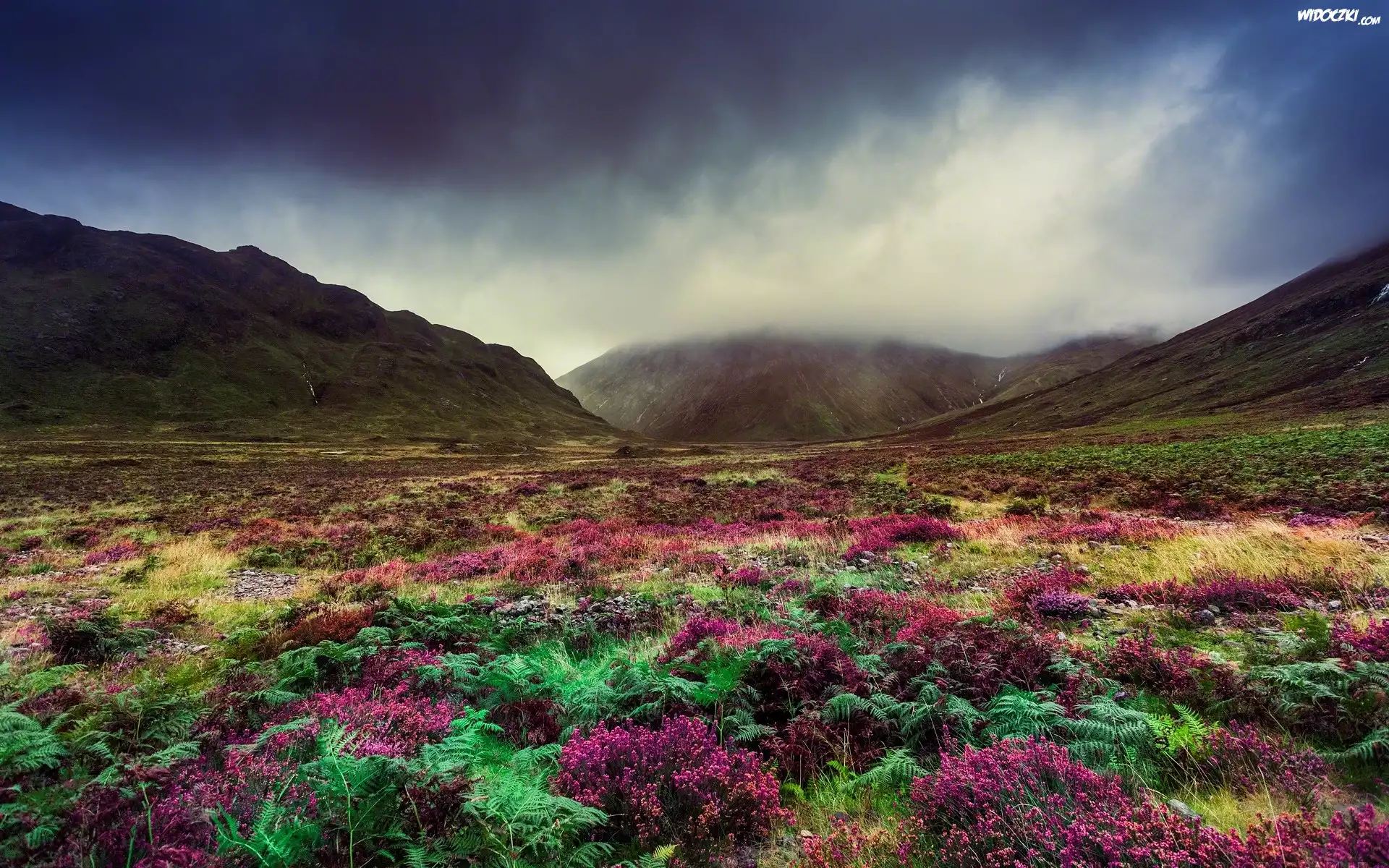 Zdjęcia, Góry, Wzgórza, Mgła, Paprocie, Wrzos