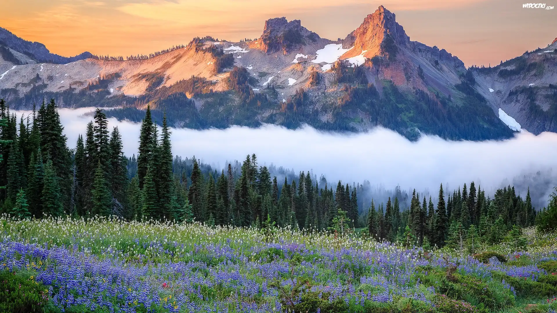 Park Narodowy Mount Rainier, Góry, Tatoosh Range, Łąka, Kwiaty, Mgła, Stan Waszyngton, Stany Zjednoczone |
