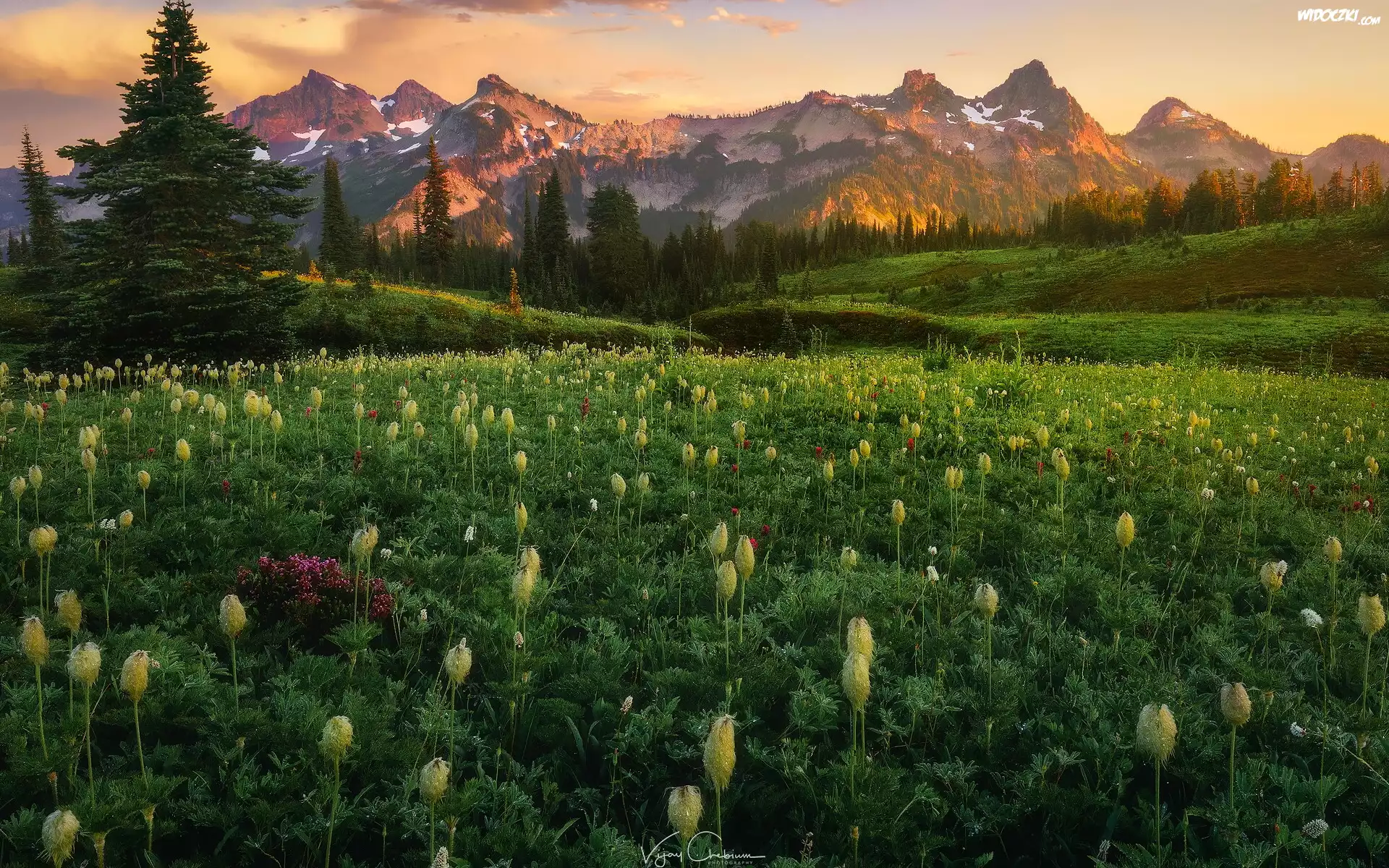 Park Narodowy Mount Rainier, Góry, Tatoosh Range, Drzewa, Łąka, Kwiaty, Stan Waszyngton, Stany Zjednoczone |