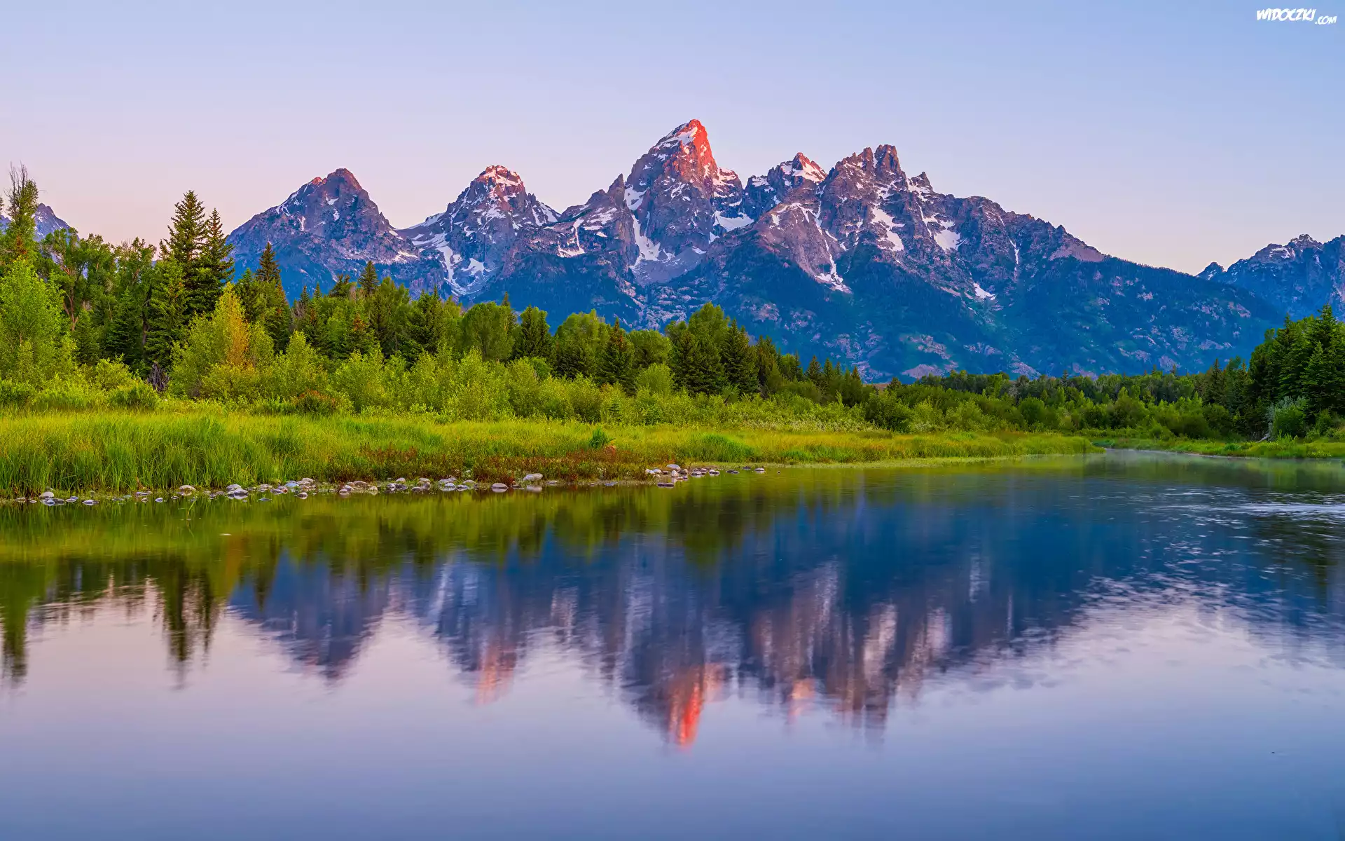Stany Zjednoczone, Stan Wyoming, Park Narodowy Grand Teton, Góry, Rzeka Snake, Odbicie, Drzewa, Trawa |