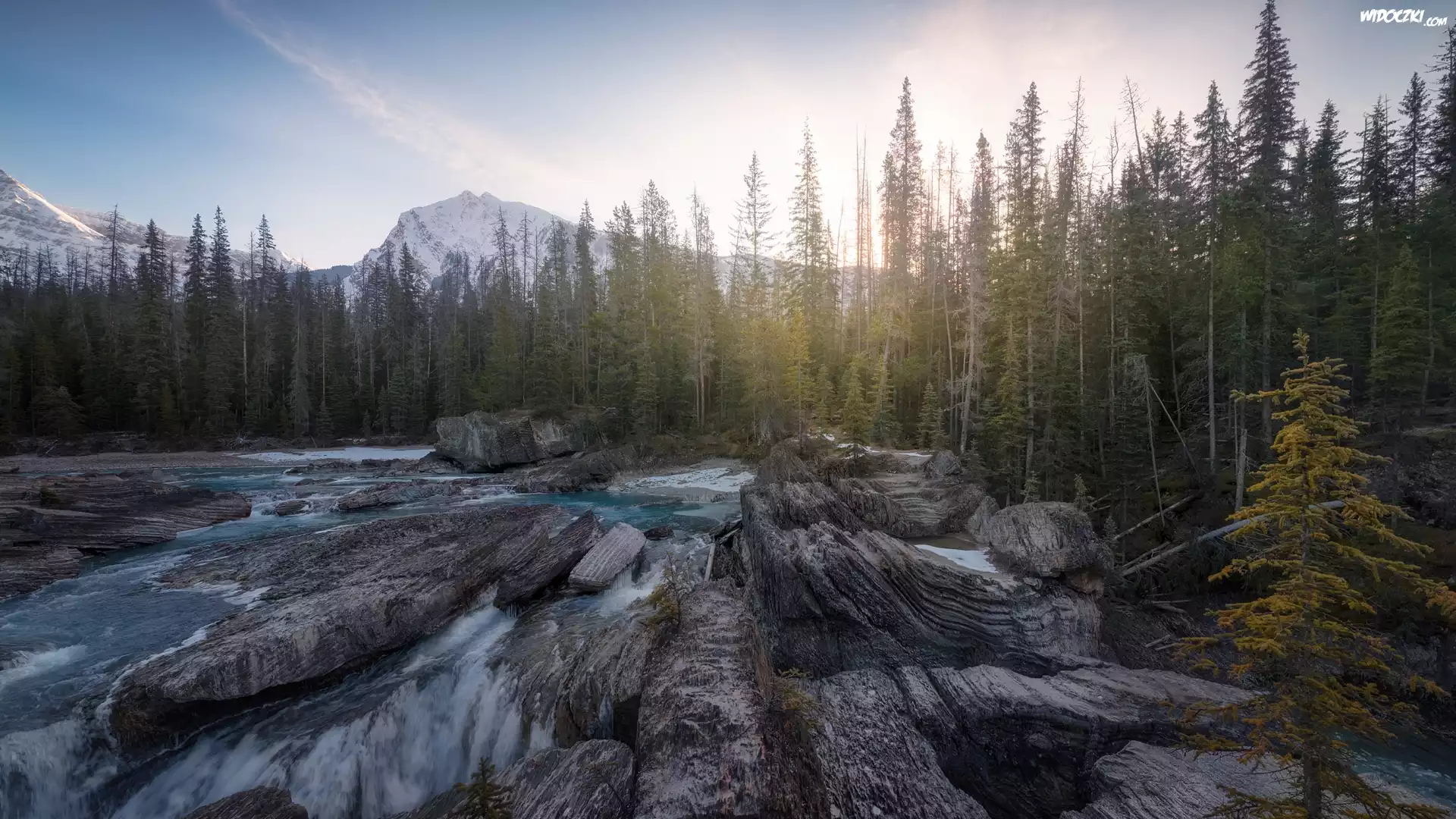 Zdjęcia, Góry, Canadian Rockies, Park Narodowy Yoho, Kolumbia Brytyjska Kanada, Drzewa, Las, Rzeka, Skały