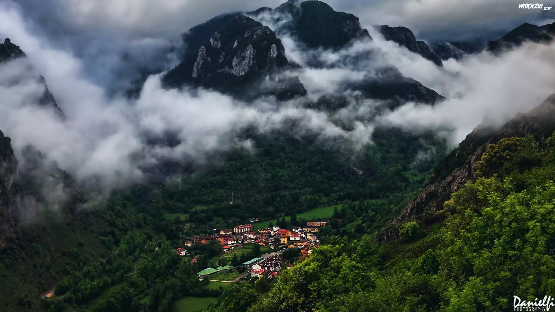 Zdjęcia, Góry, Dolina, Domy, Mgła, Lasy, La Pola Somiedo, Hiszpania