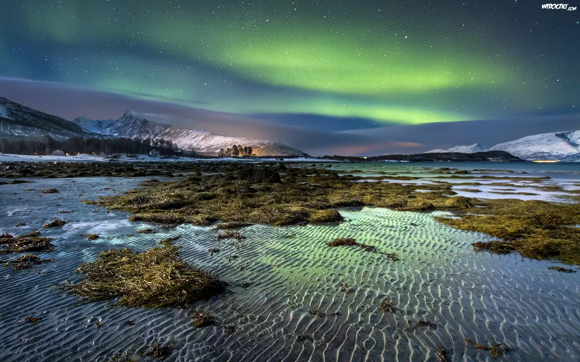 Zdjęcia, Góry, Śnieg, Zorza, Polarna, Norwegia