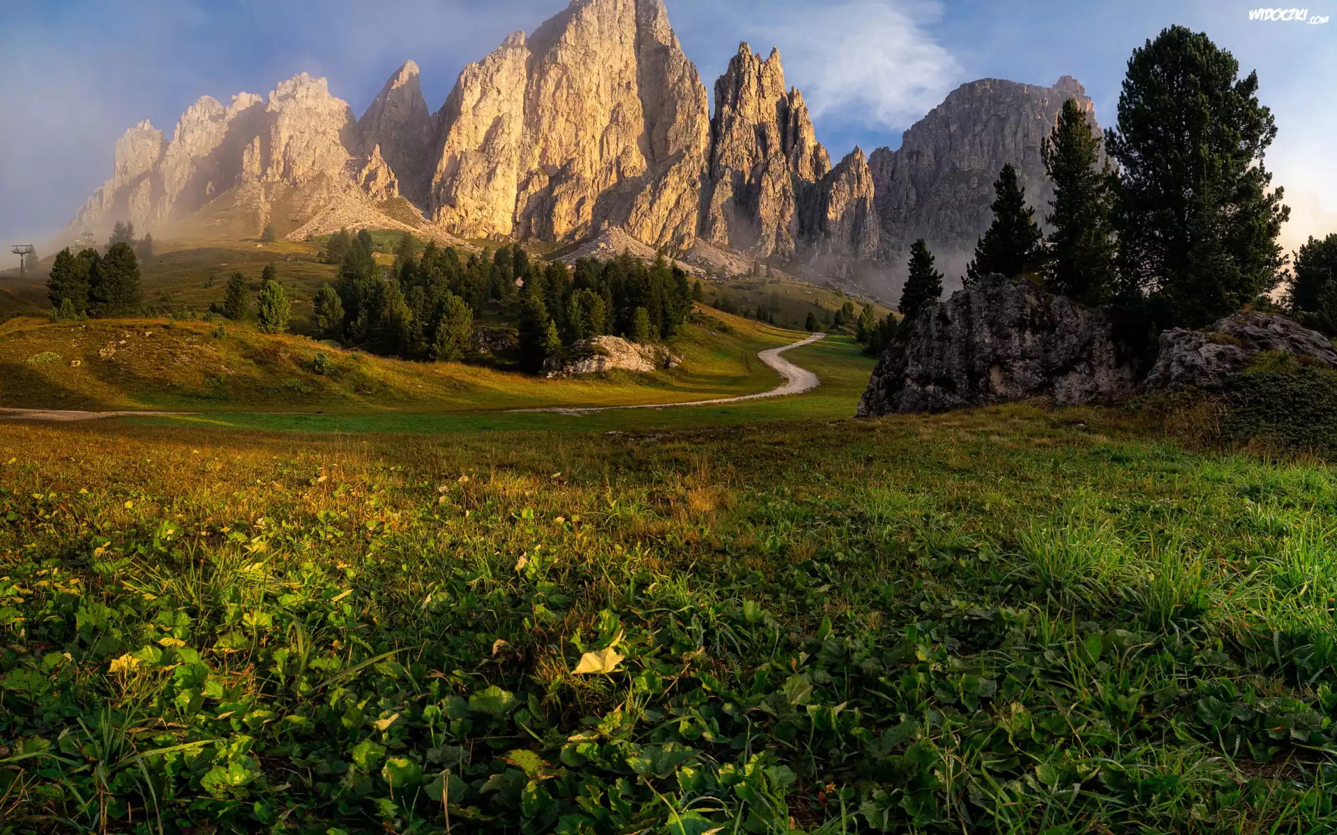 Zdjęcia, Góry, Dolomity, Mgła, Łąki, Droga, Drzewa, Południowy Tyrol, Włochy