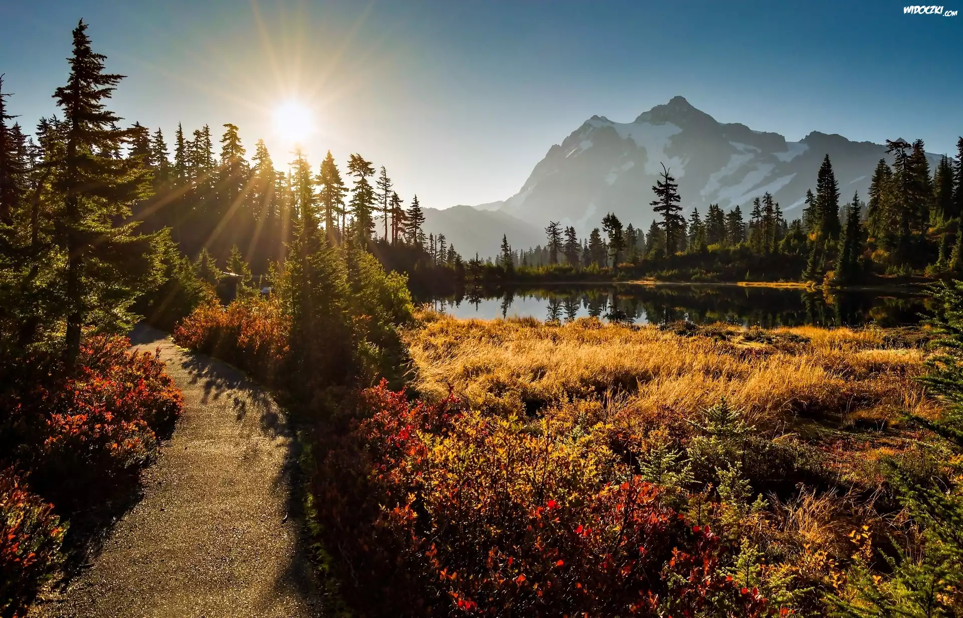 Góry, Jezioro, Wschód Słońca, Poranek, Jesień
