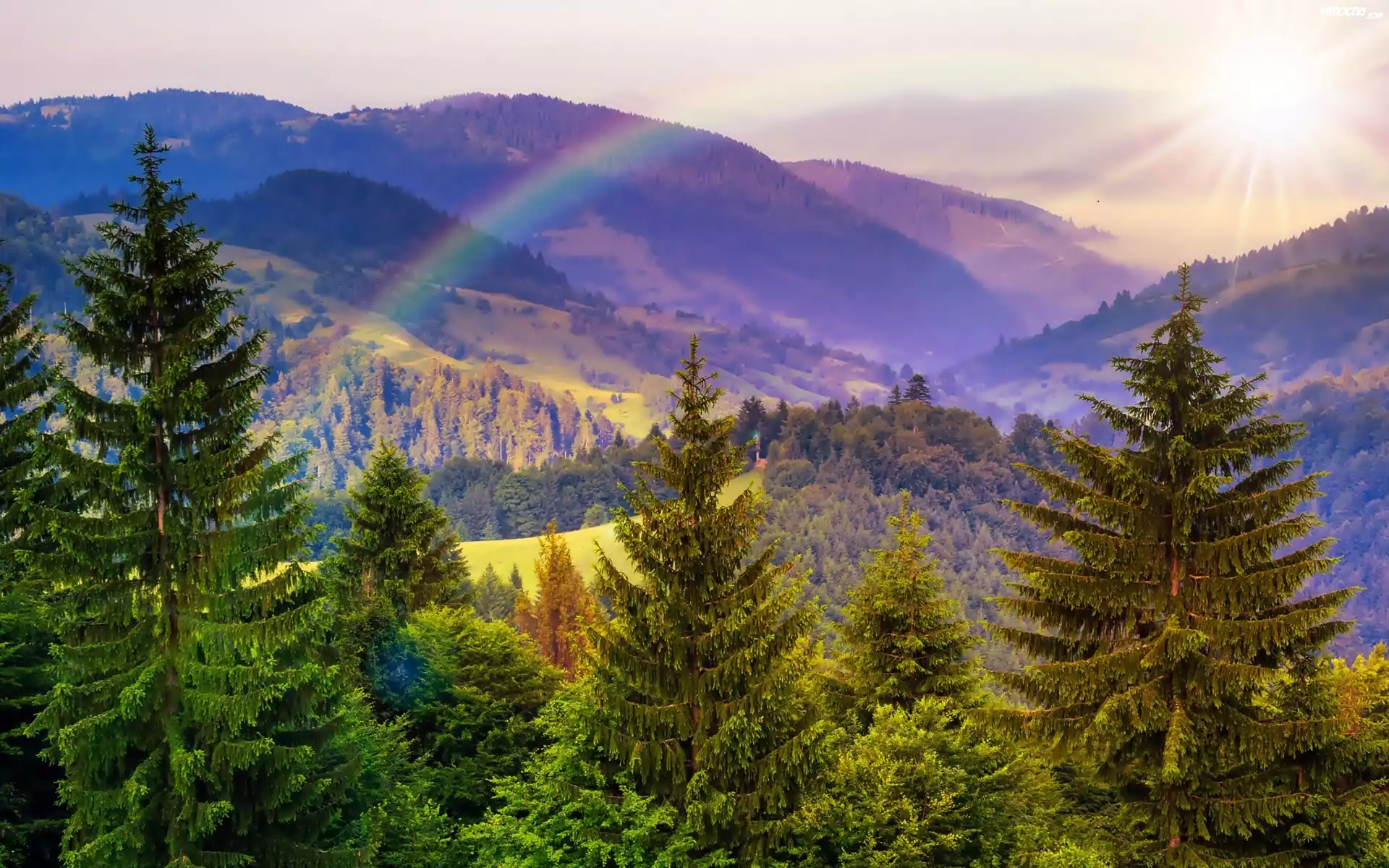 Góry, Lasy, Łąki, Tęcza, Promienie, Słońca