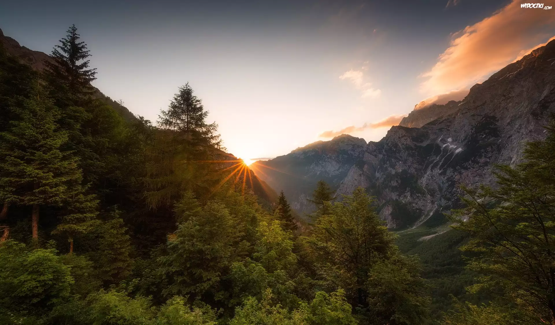 Góry, Las, Dolina, Poranek, Promienie słońca