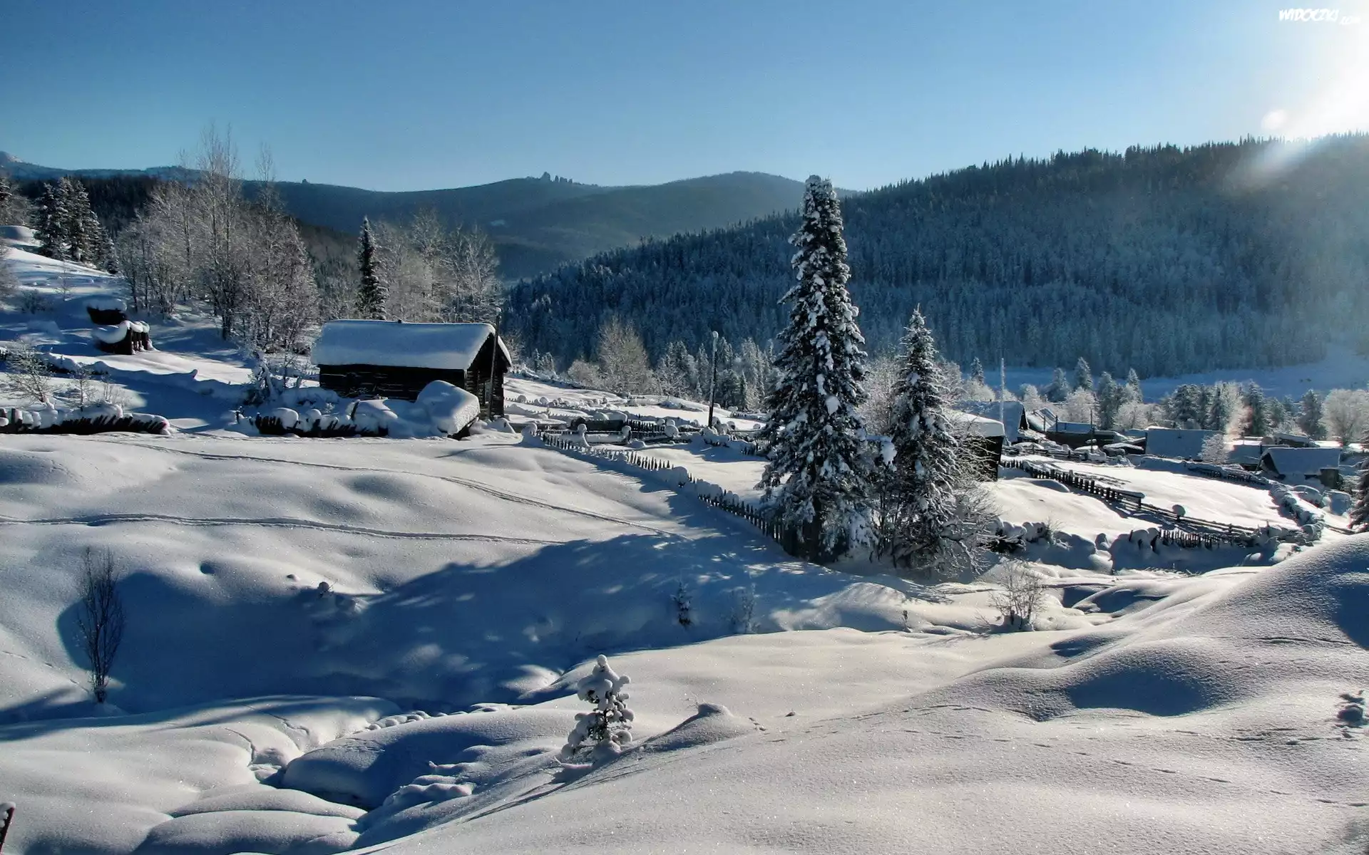 Góry, Lasy, Domek, Śnieg, Promienie, Słońca