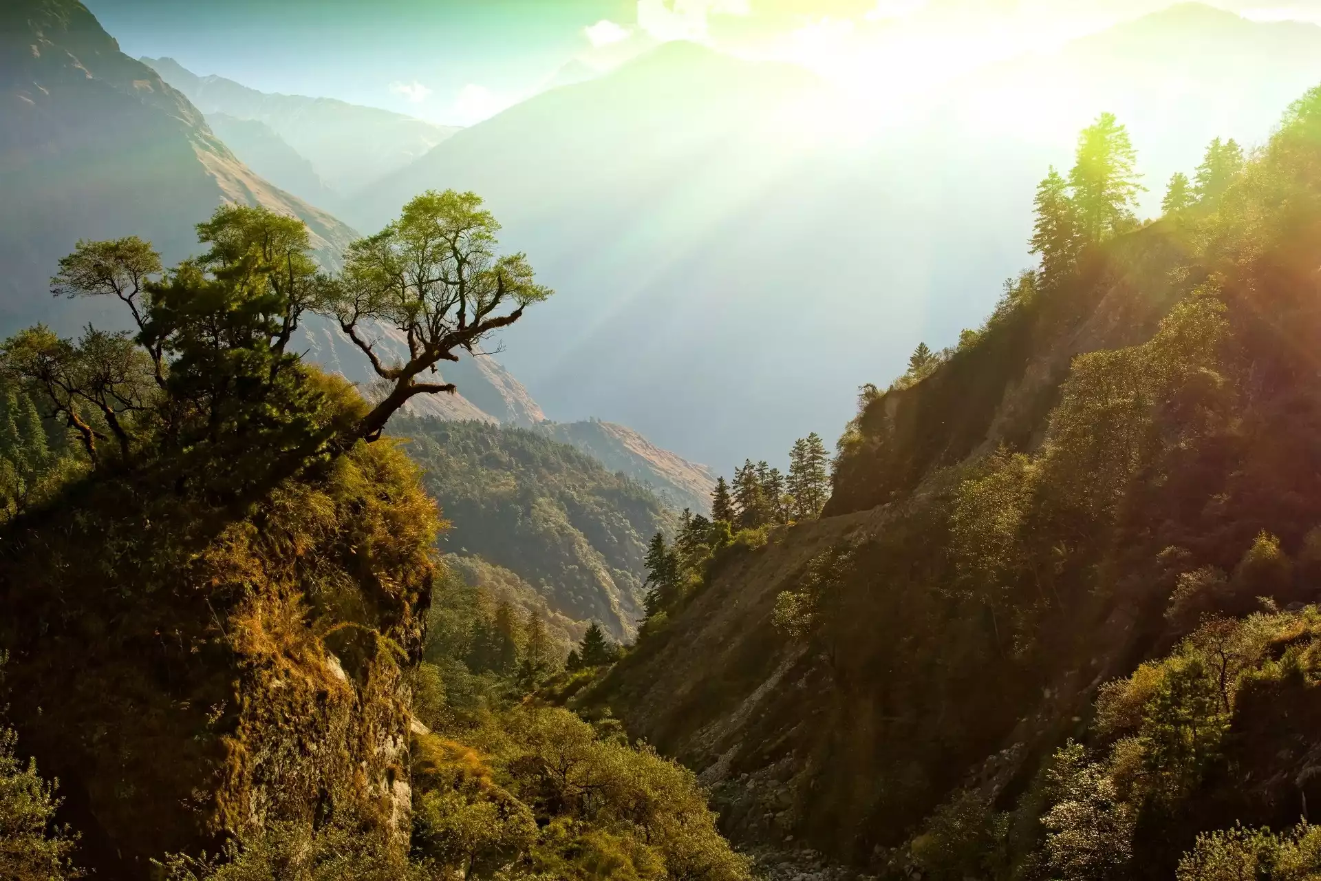 Zdjęcia, Góry, Drzewa, Promienie, Słońca