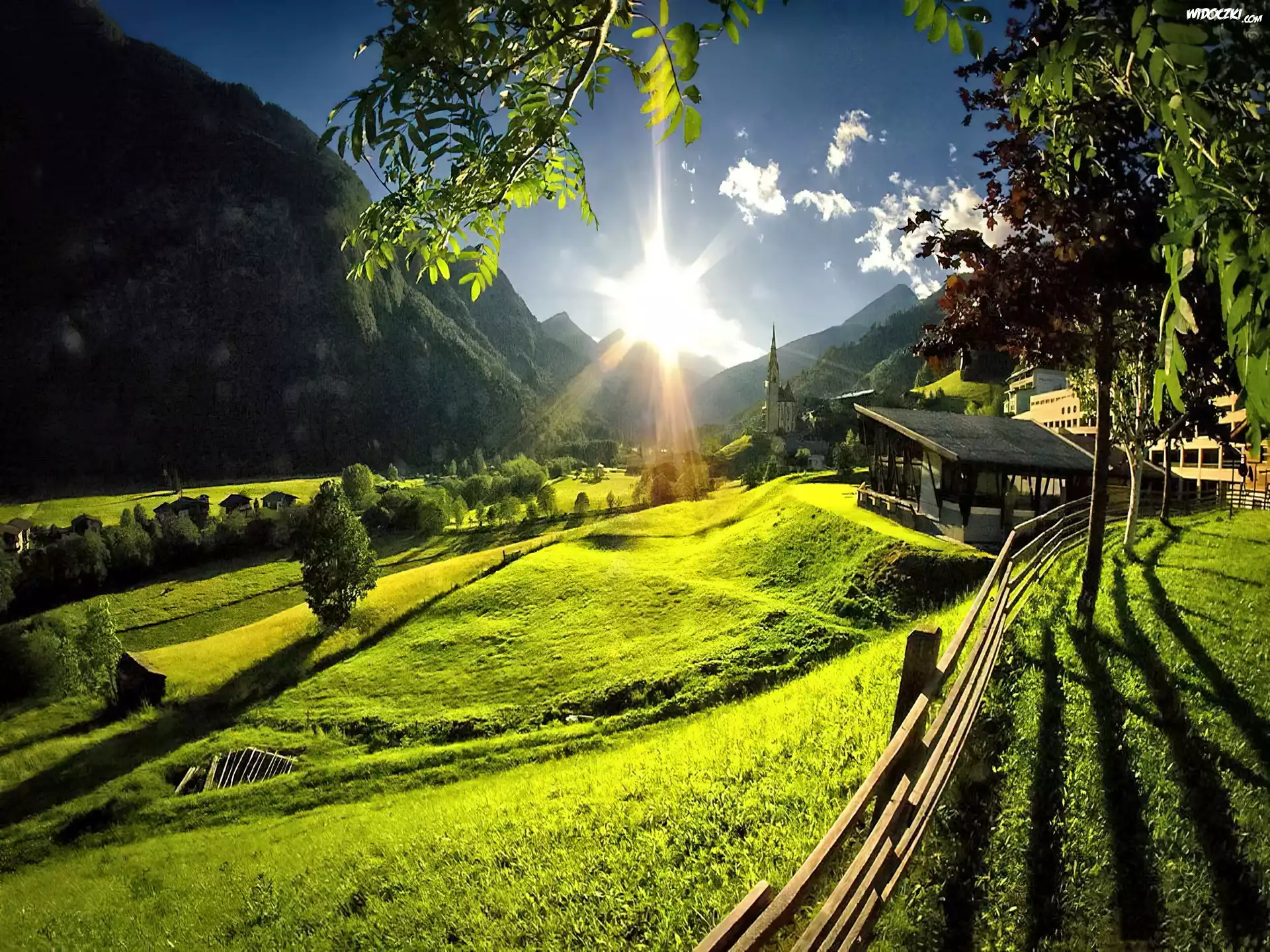 Zdjęcia, Góry, Dolina, Miasteczko, Promienie, Słońca