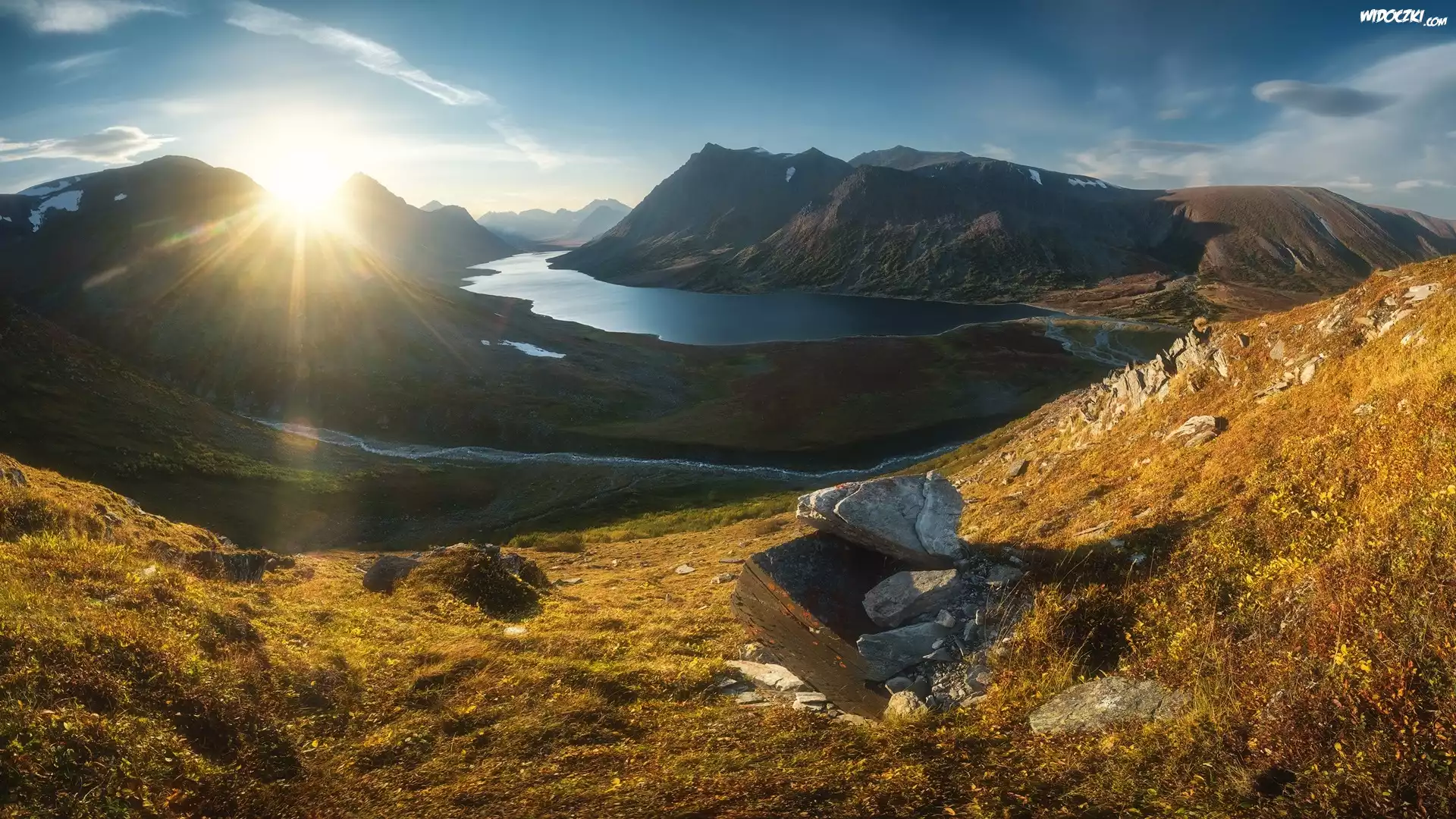 Góry, Rzeka, Skały, Promienie słońca