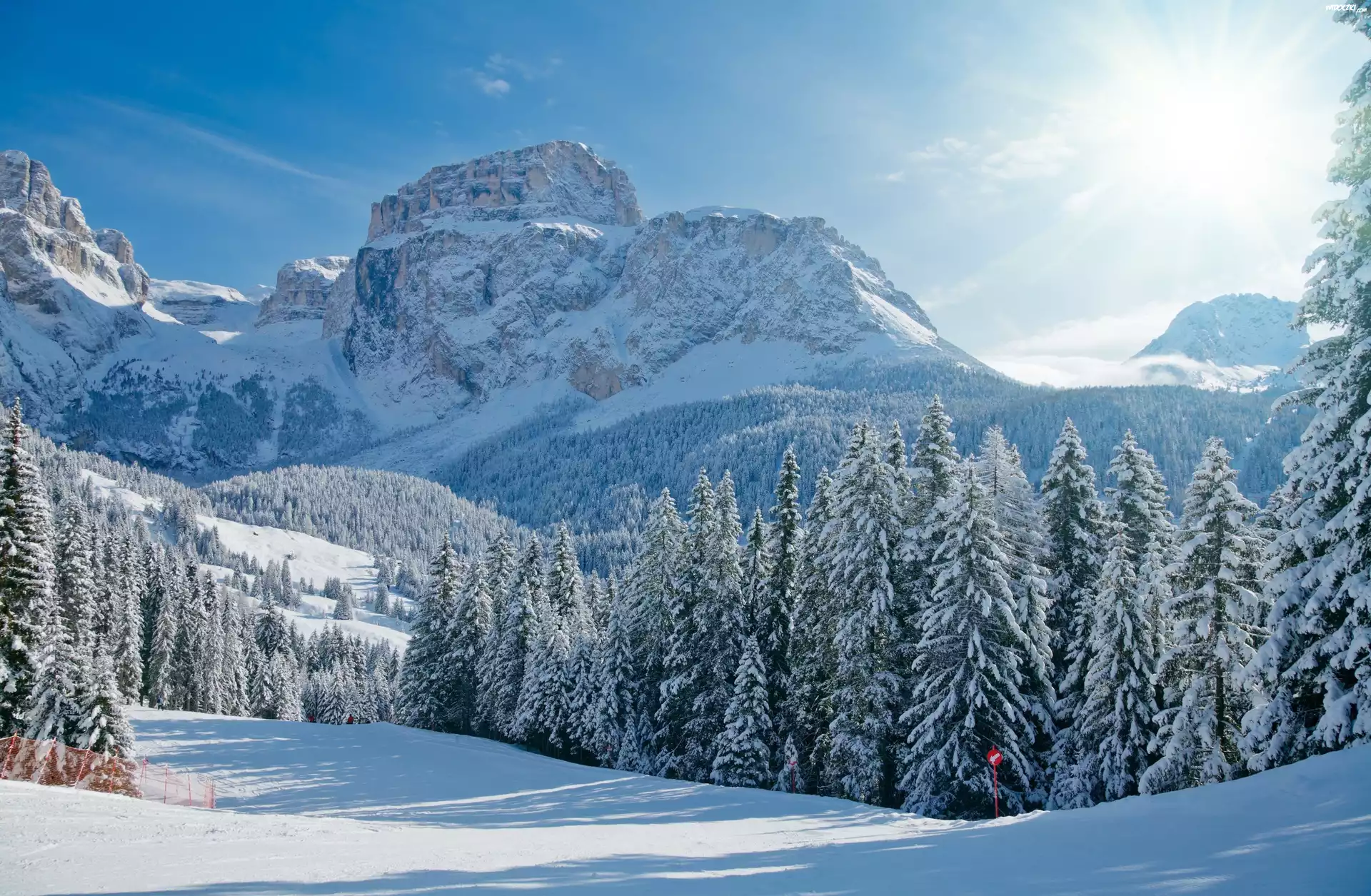 Góry, Las, Zima, Promienie słońca