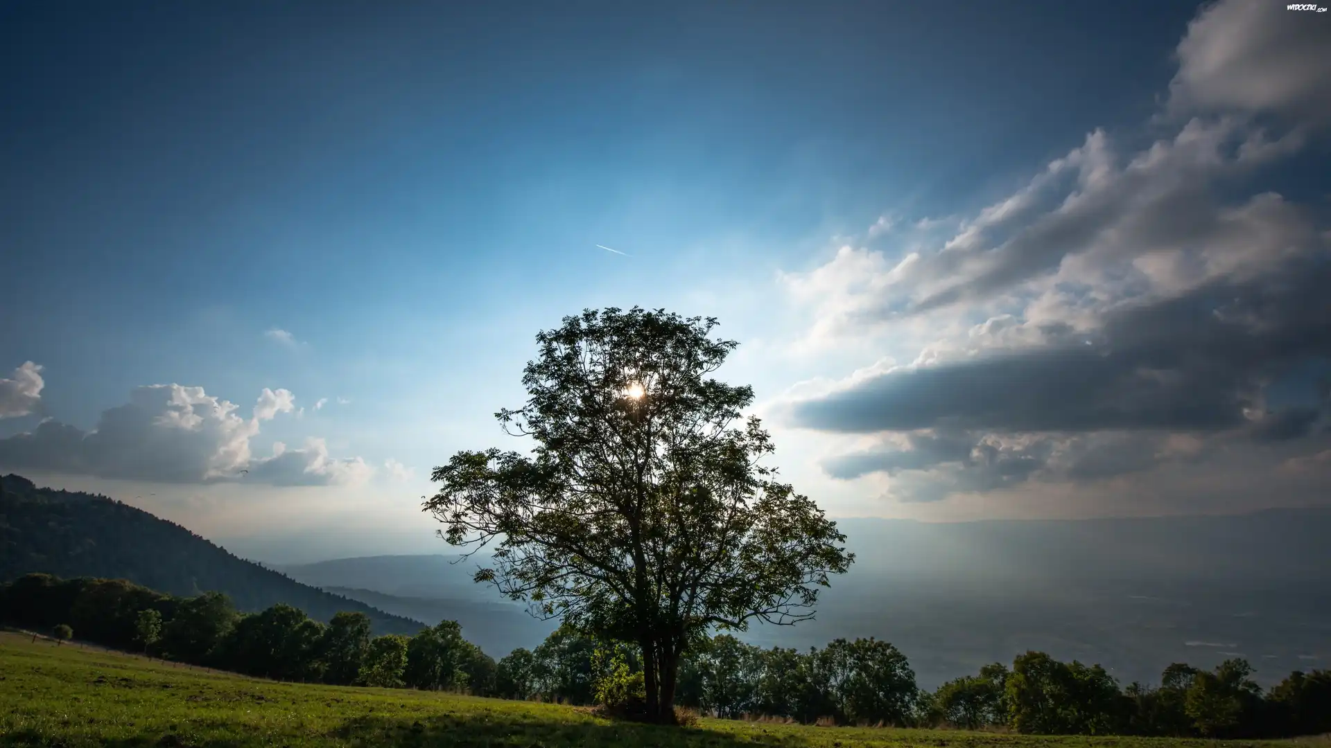 Góry, Drzewa, Chmury, Przebijające, Światło