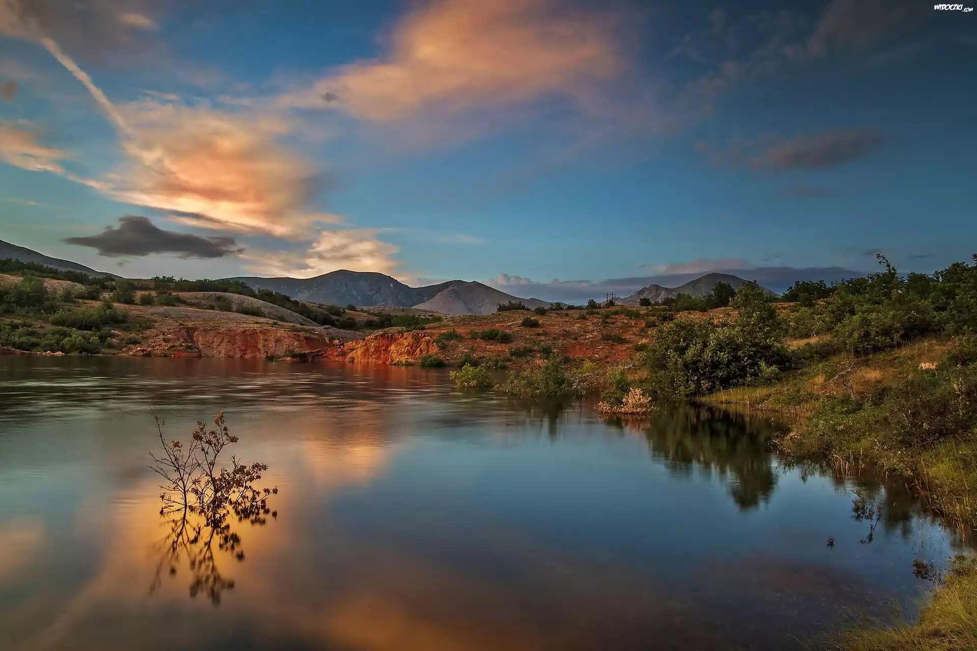 Zdjęcia, Góry, Chmury, Jezioro, Przebijające, Światło