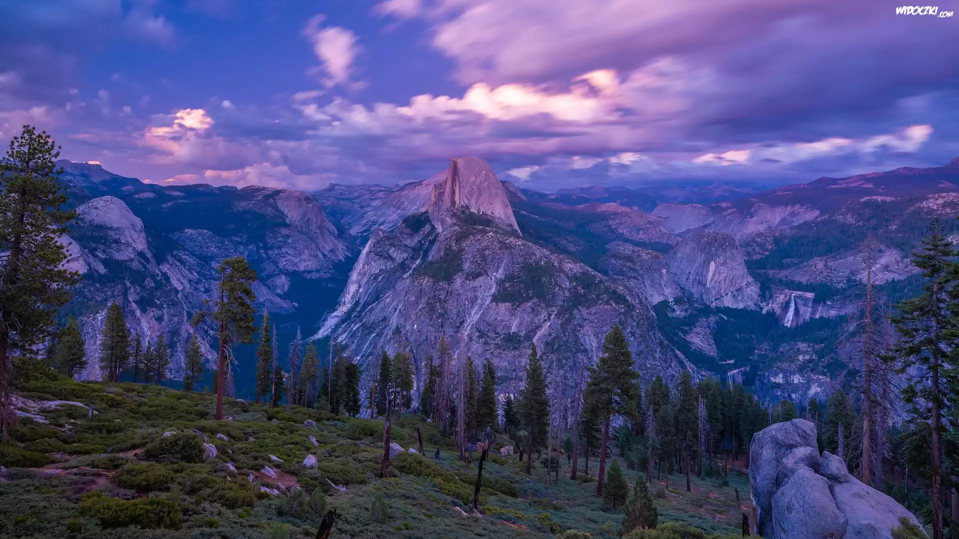 Punkt widokowy, Glacier Point, Góry, Drzewa, Zachód słońca, Park Narodowy Yosemite, Kalifornia, Stany Zjednoczone |