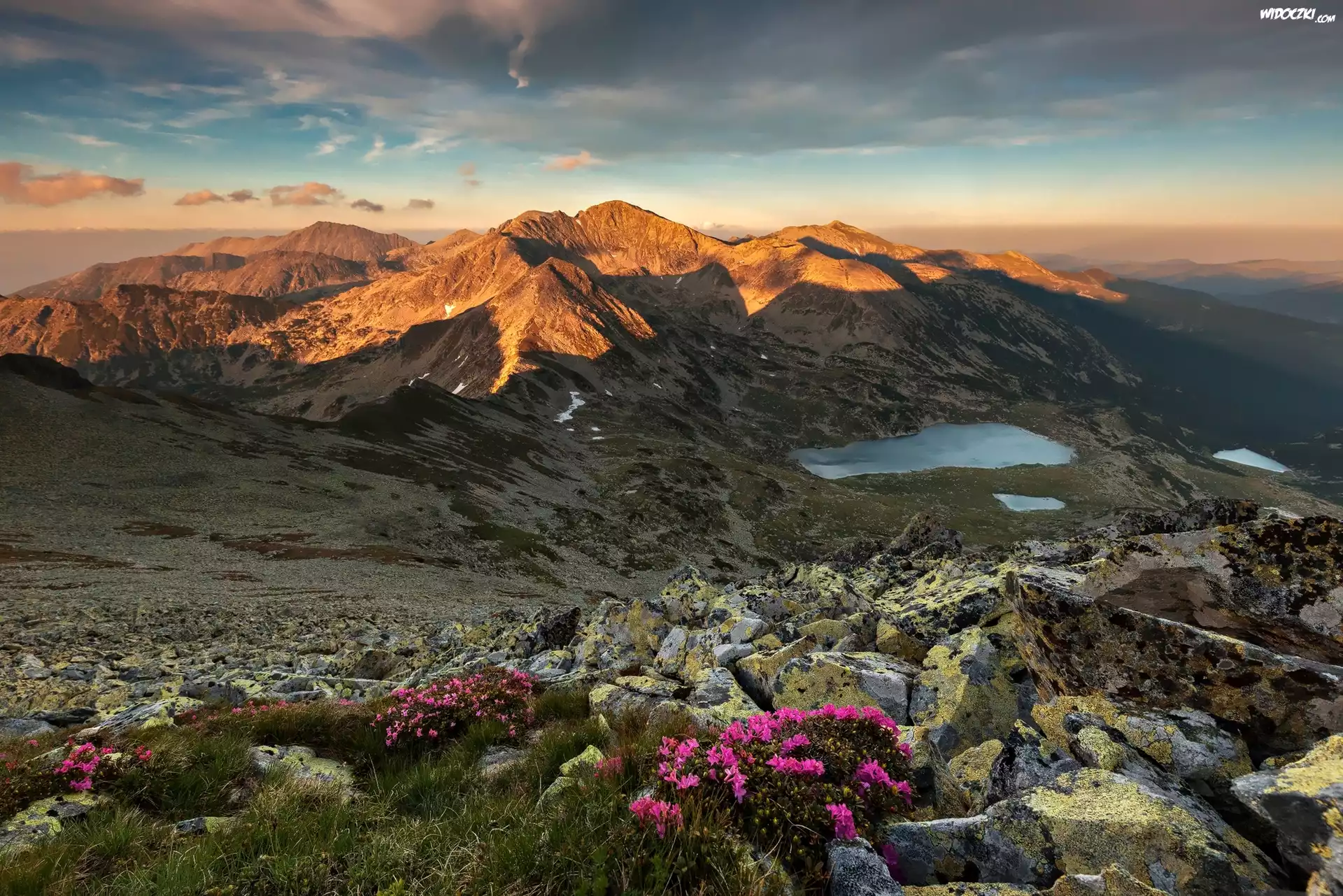 Góry Retezat, Karpaty Południowe, Skały, Kamienie, Roślinność, Kwiaty, Jezioro Bucura, Zachód słońca, Park Narodowy Retezat, Rumunia |