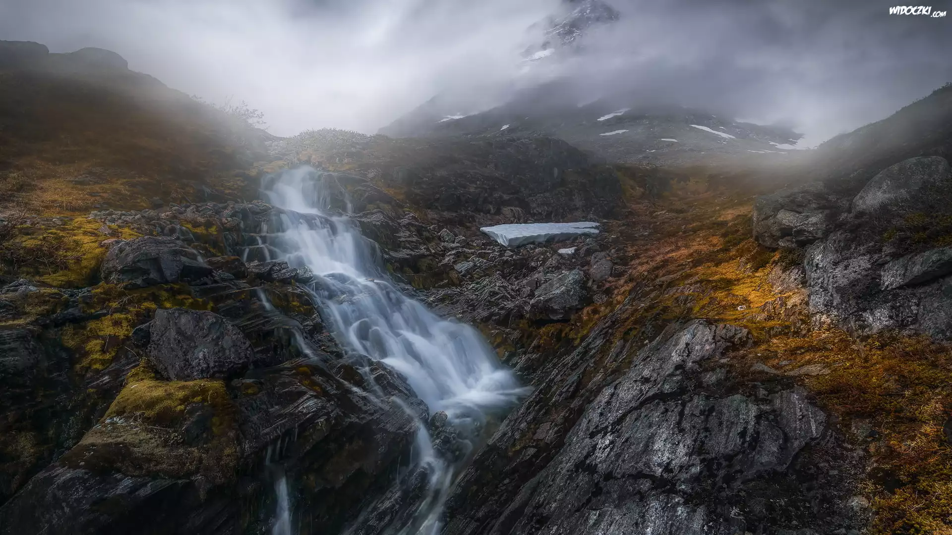 Zdjęcia, Góry, Skały, Rzeka, Mgła, Romsdalen, Norwegia
