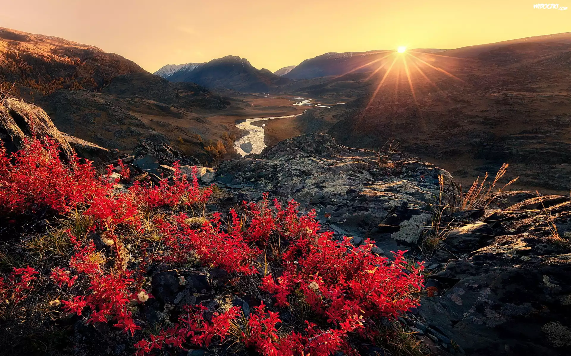 Rosja, Góry, Ałtaj, Czerwone, Rośliny, Promienie słońca