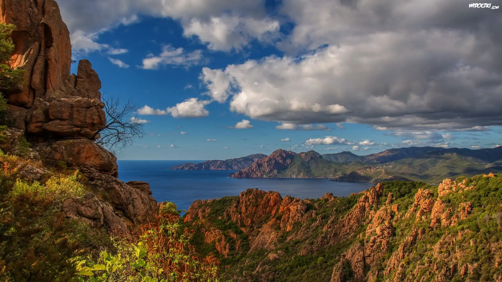 Zdjęcia, Morze, Góry, Rośliny, Skały, Chmury