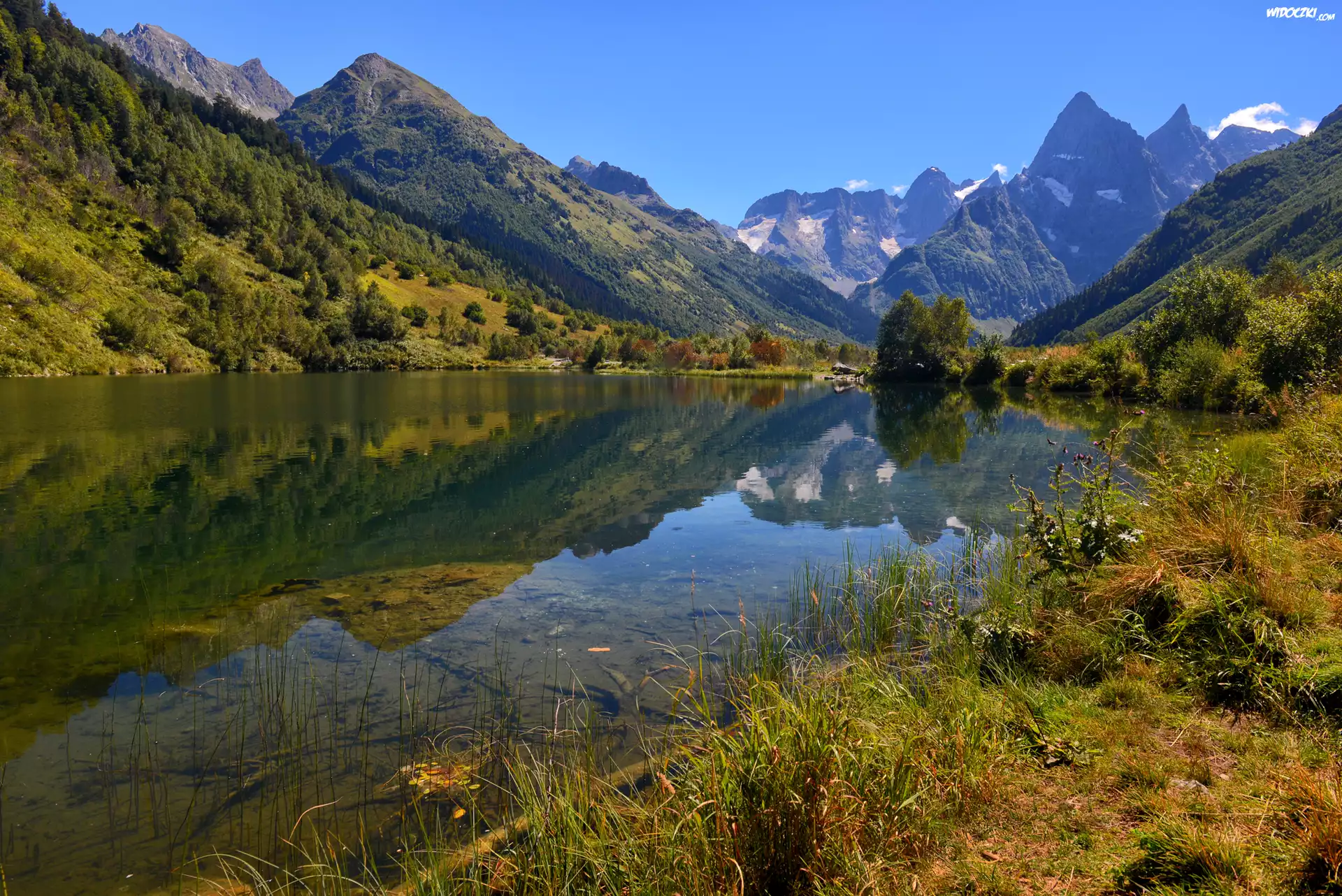 Góry, Jezioro, Drzewa, Rośliny, Odbicie