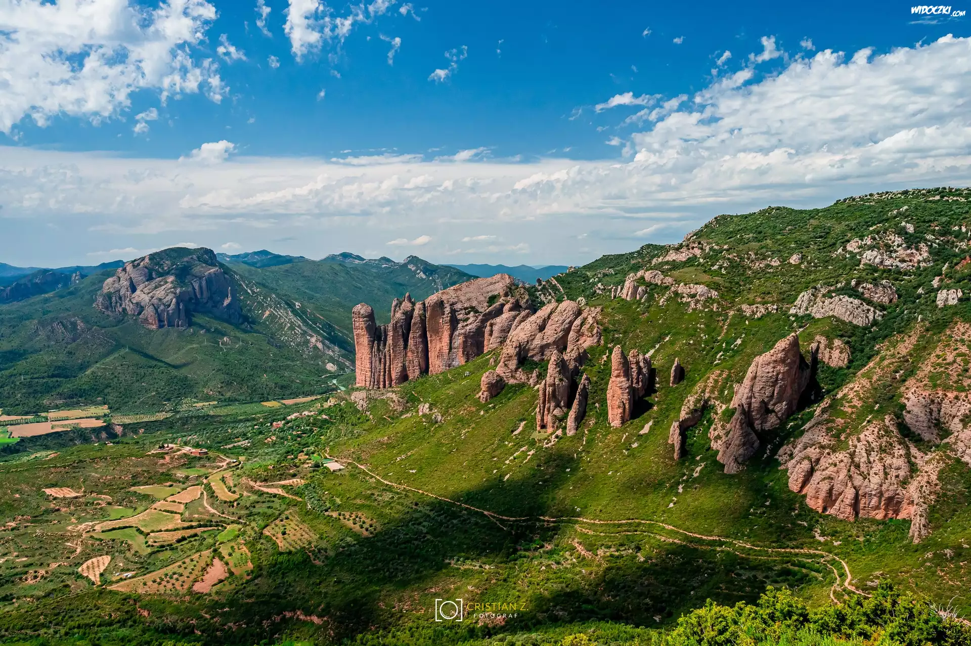 Zdjęcia, Góry, Skały, Formacje skalne, Mallos de Riglos, Dolina, Rośliny, Hiszpania