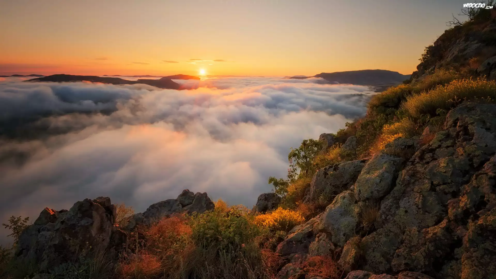 Wschód słońca, Mgła, Góry, Kamienie, Rośliny