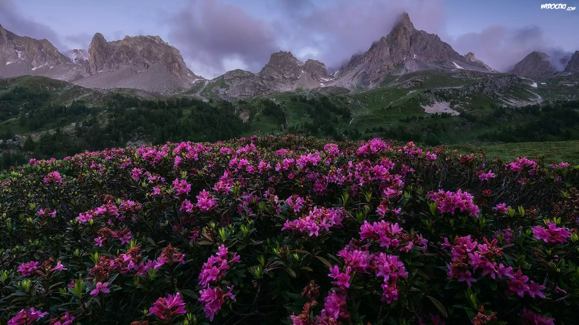 Zdjęcia, Góry, Drzewa, Kwiaty, Różaneczniki, Chmury