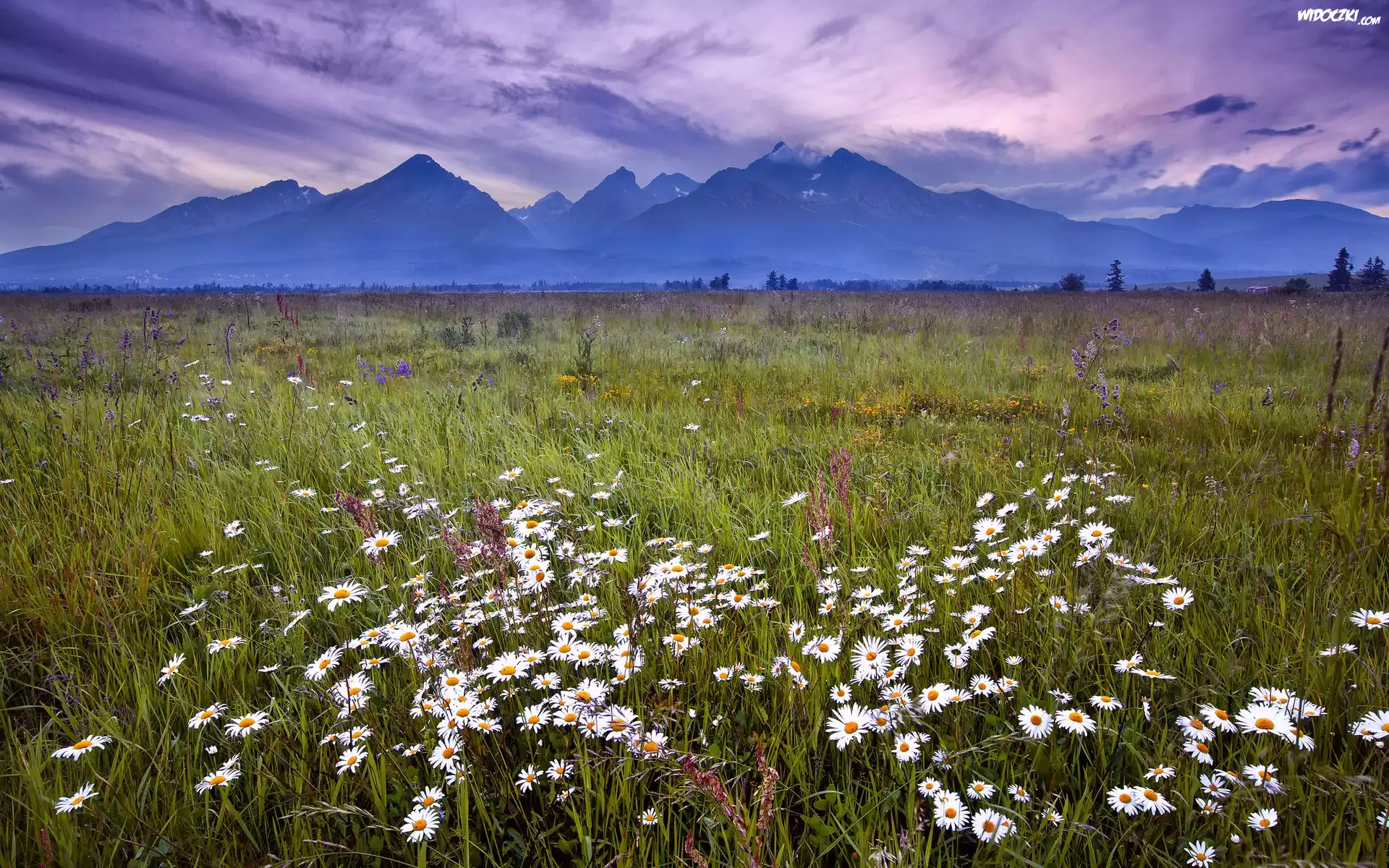 Zdjęcia, Łąka, Rumianki, Trawa, Góry, Chmury
