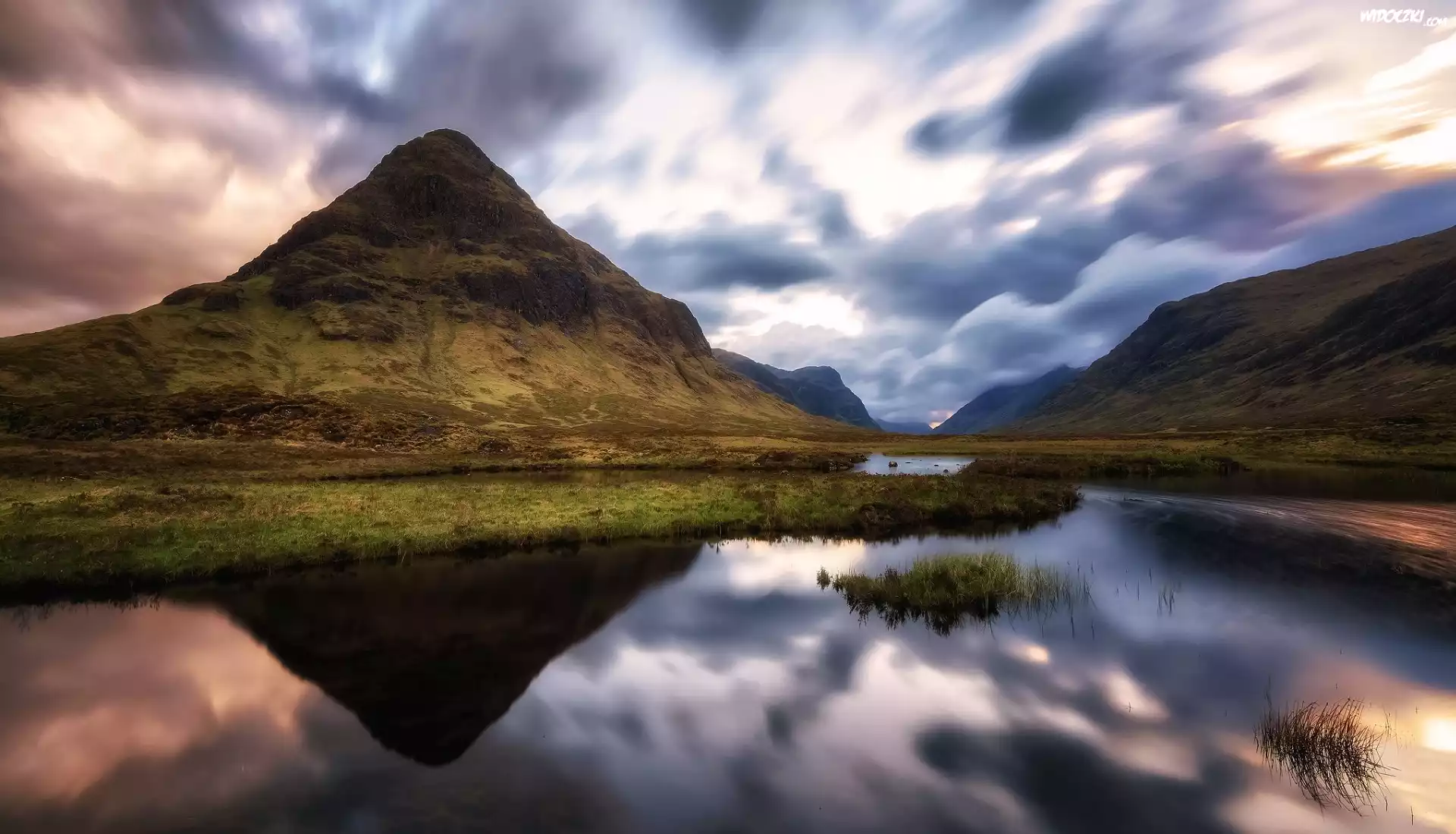 Zdjęcia, Góry, Chmury, Rzeka, Roślinność