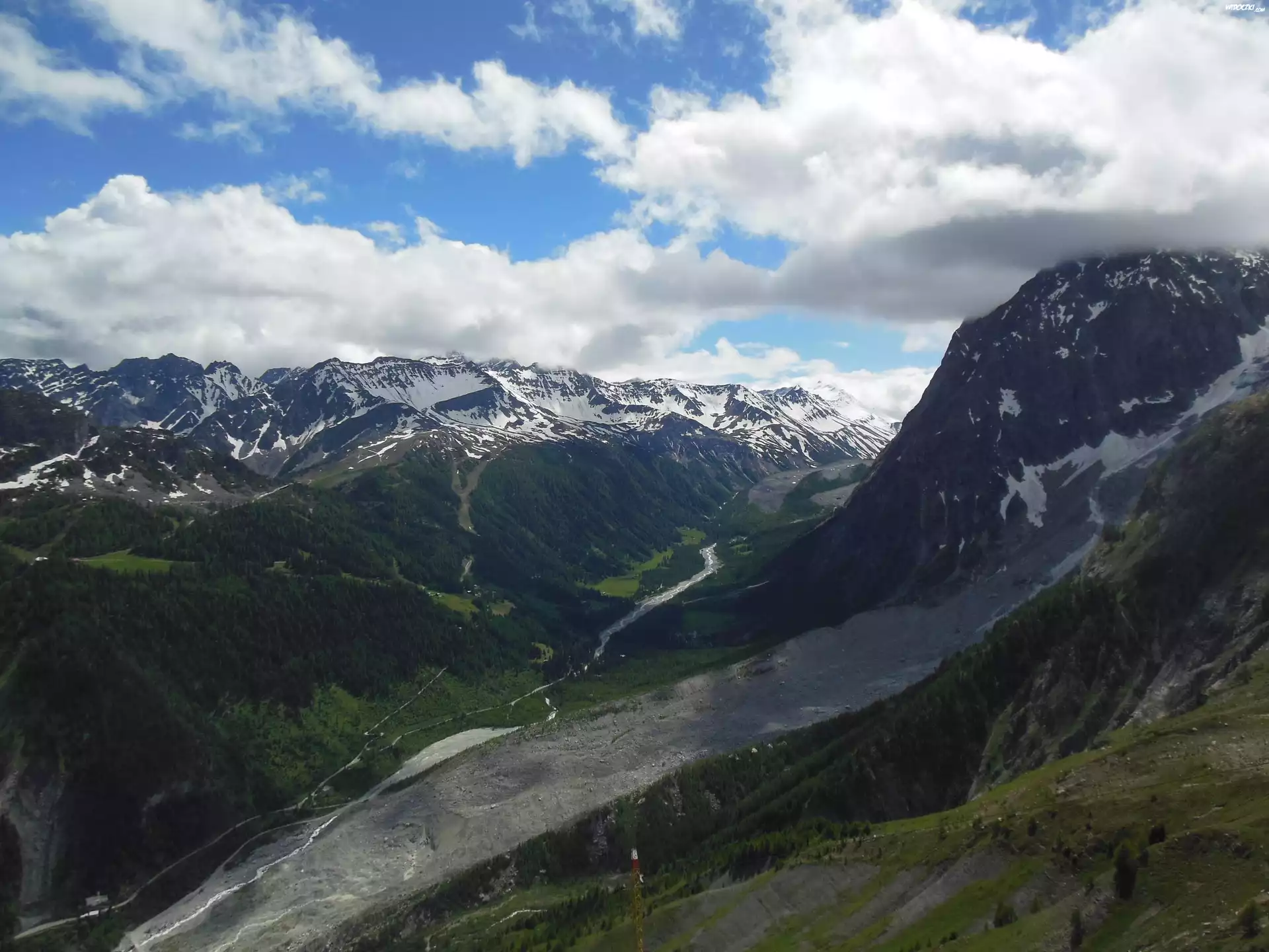 Góry, Śnieg, Drzewa, Rzeka, Chmury