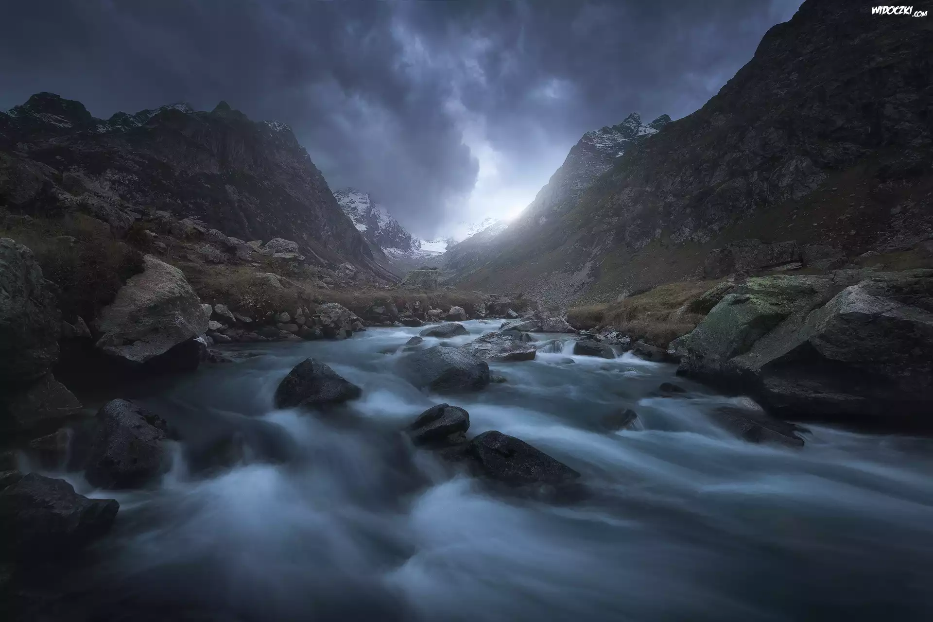 Zdjęcia, Góry, Skały, Kamienie, Rzeka, Chmury