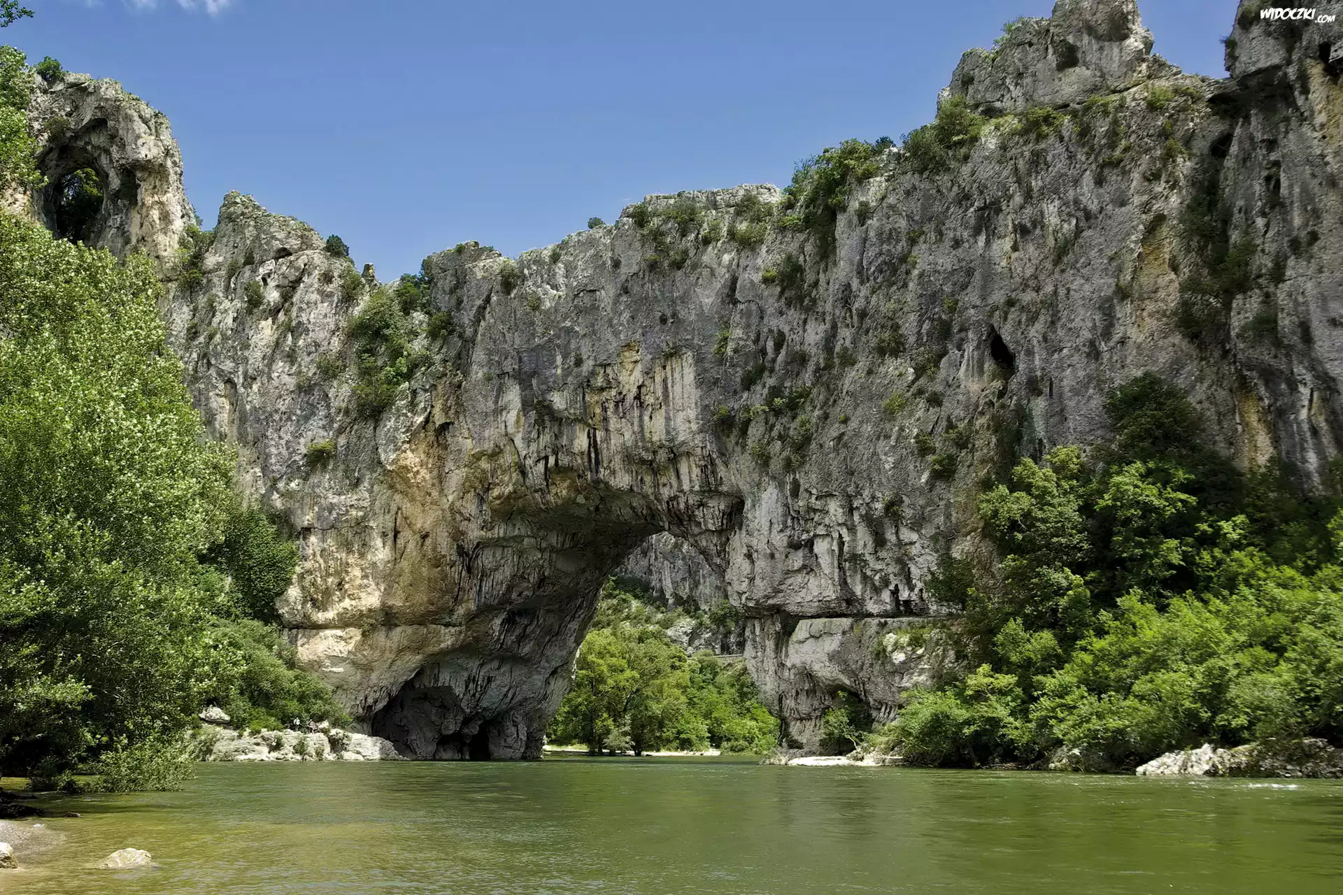 Góry, Drzewa, Klif, Rzeka, Krzewy