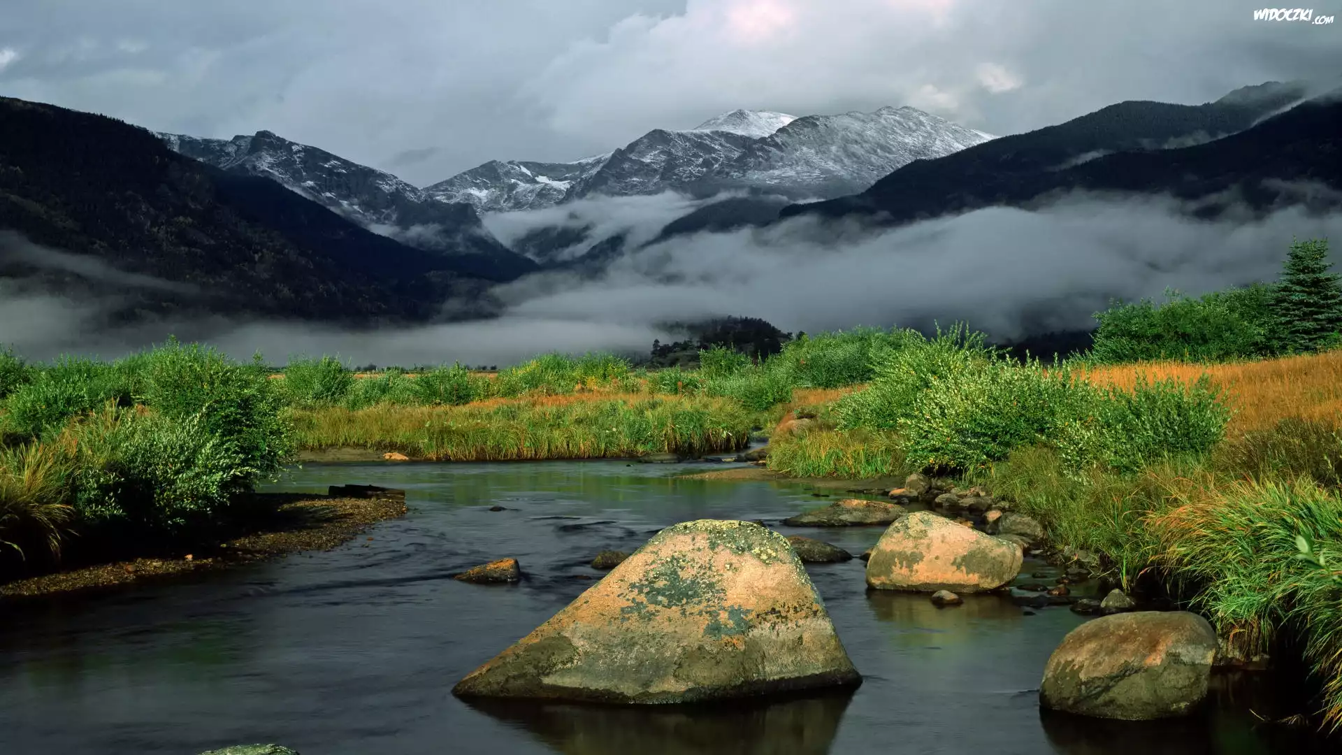 Zdjęcia, Góry, Mgła, Rzeka, Kamienie