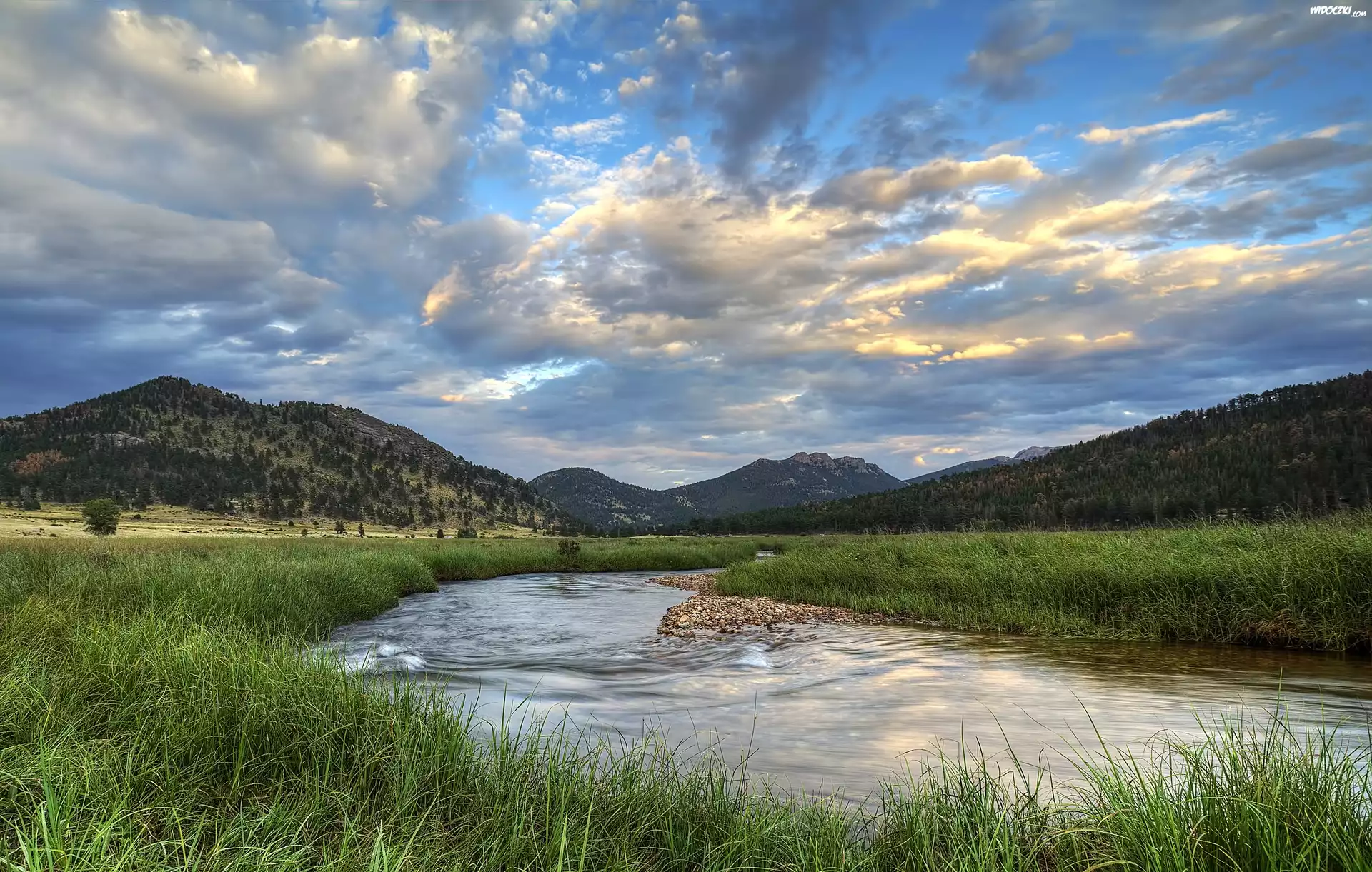 Góry, Zachmurzone, Niebo, Rzeka, Łąki