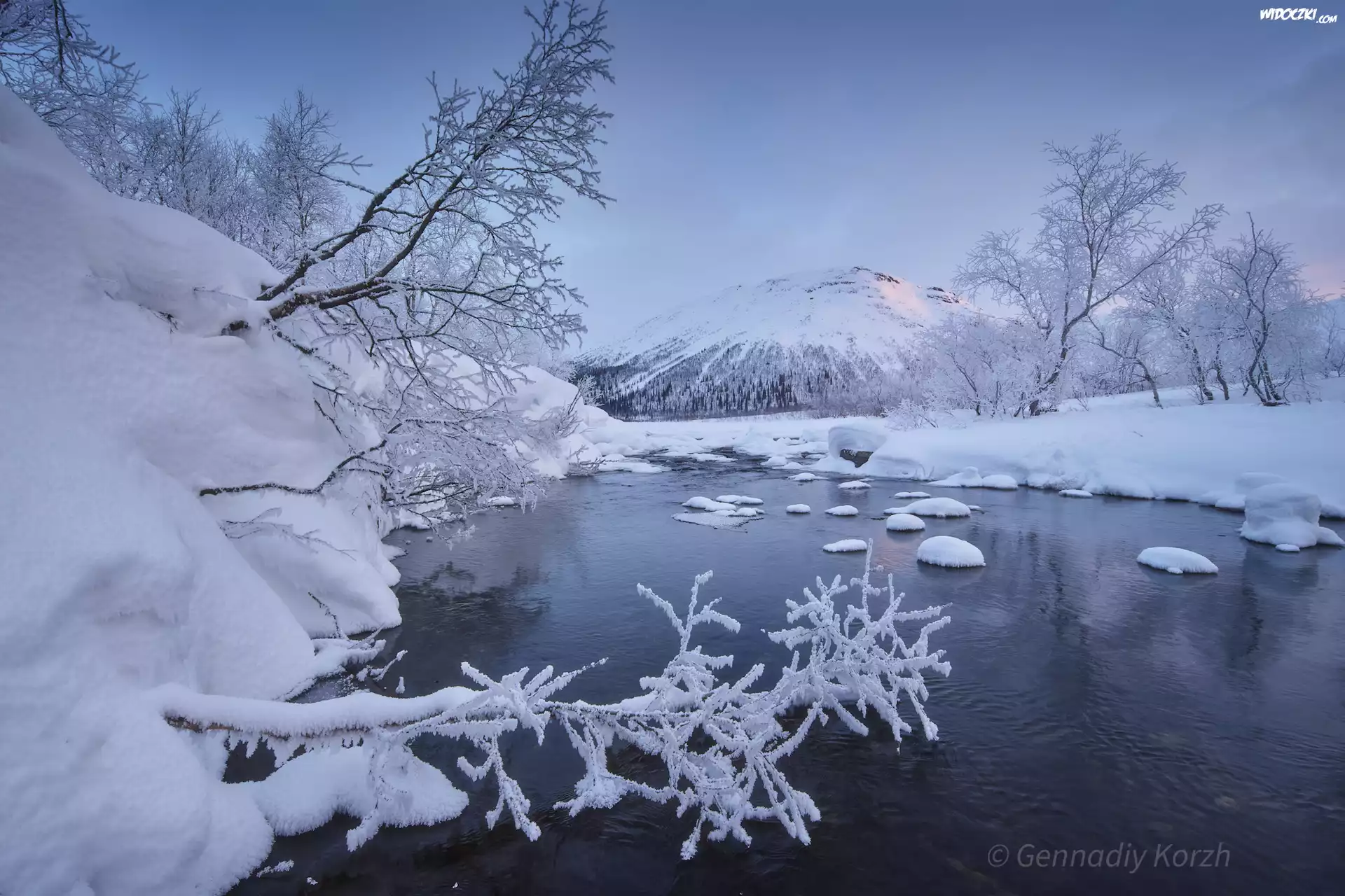 Zdjęcia, Zima, Śnieg, Rzeka, Góry, Las, Ośnieżone, Drzewa