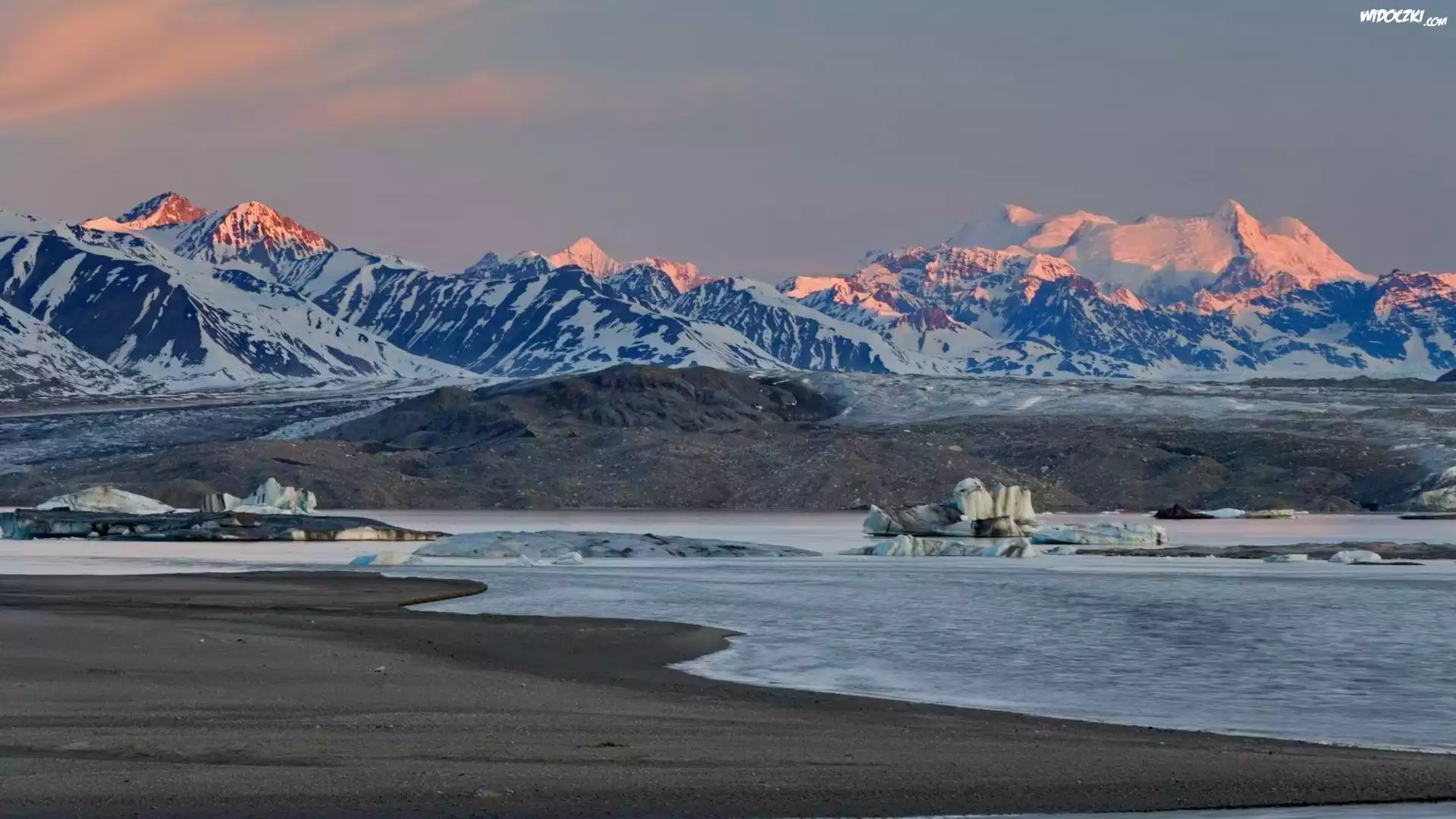 Góry, Śnieg, Zachód, Słońca, Rzeka, Kanada