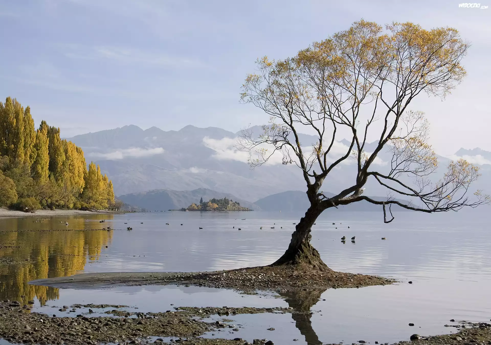 Zdjęcia, Góry, Jezioro, Samotne, Drzewo