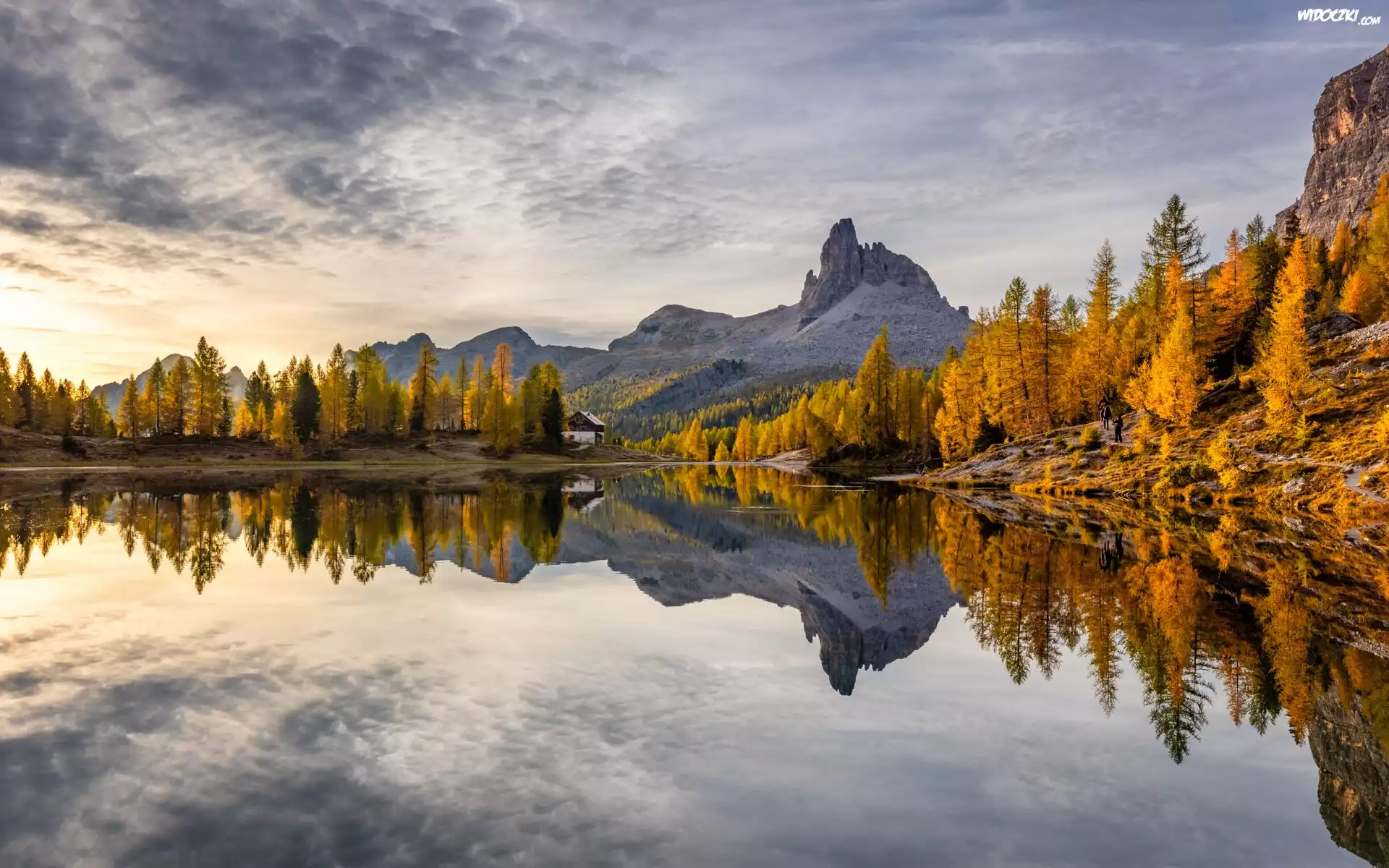 Jezioro, Federa Lake, Góry, Dolomity, Las, Drzewa, Jesień, Dom, Schronisko, Prowinca Belluno, Włochy |