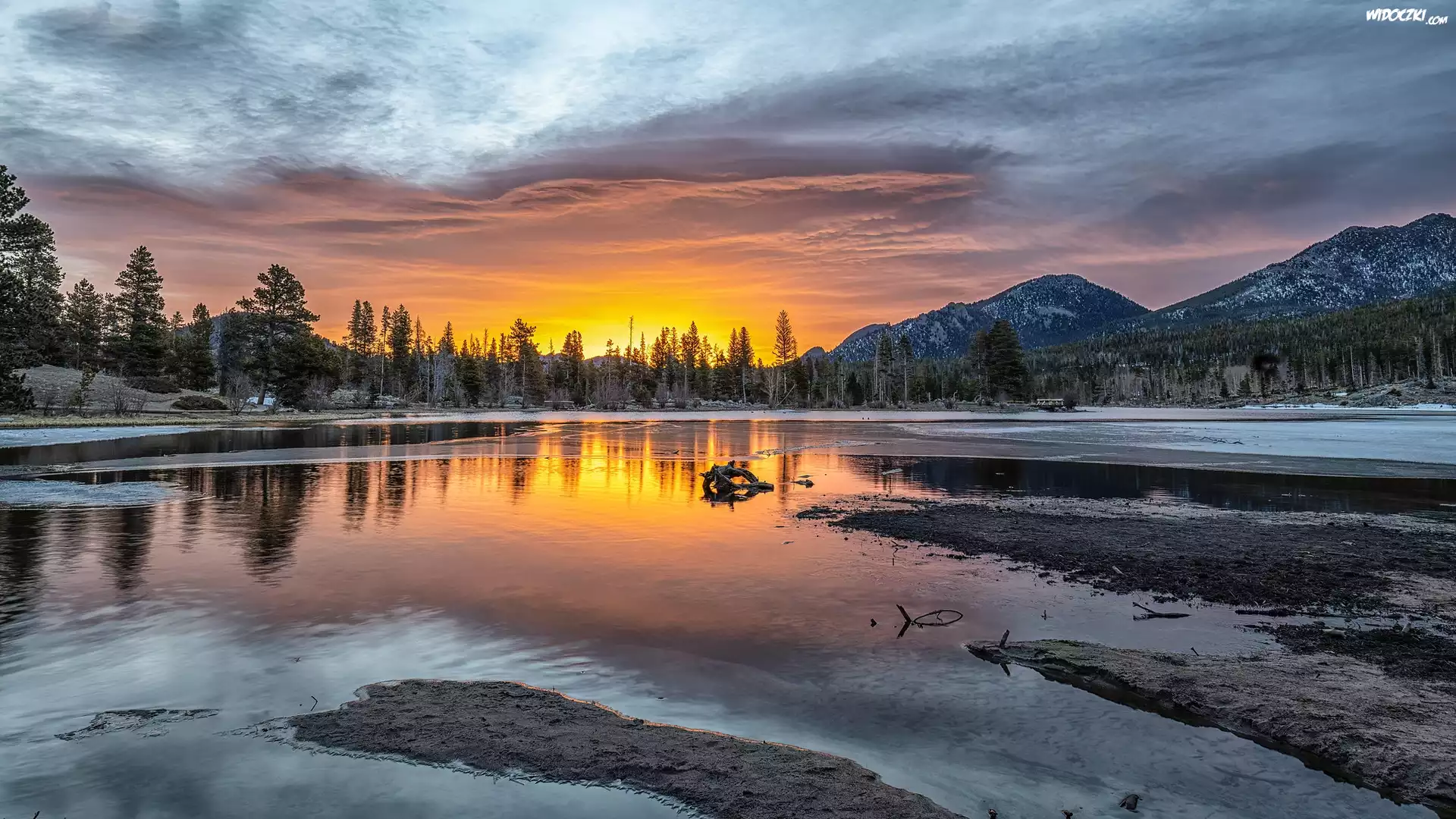 Jezioro, Sprague Lake, Góry, Wschód słońca, Park Narodowy Gór Skalistych, Kolorado, Stany Zjednoczone |