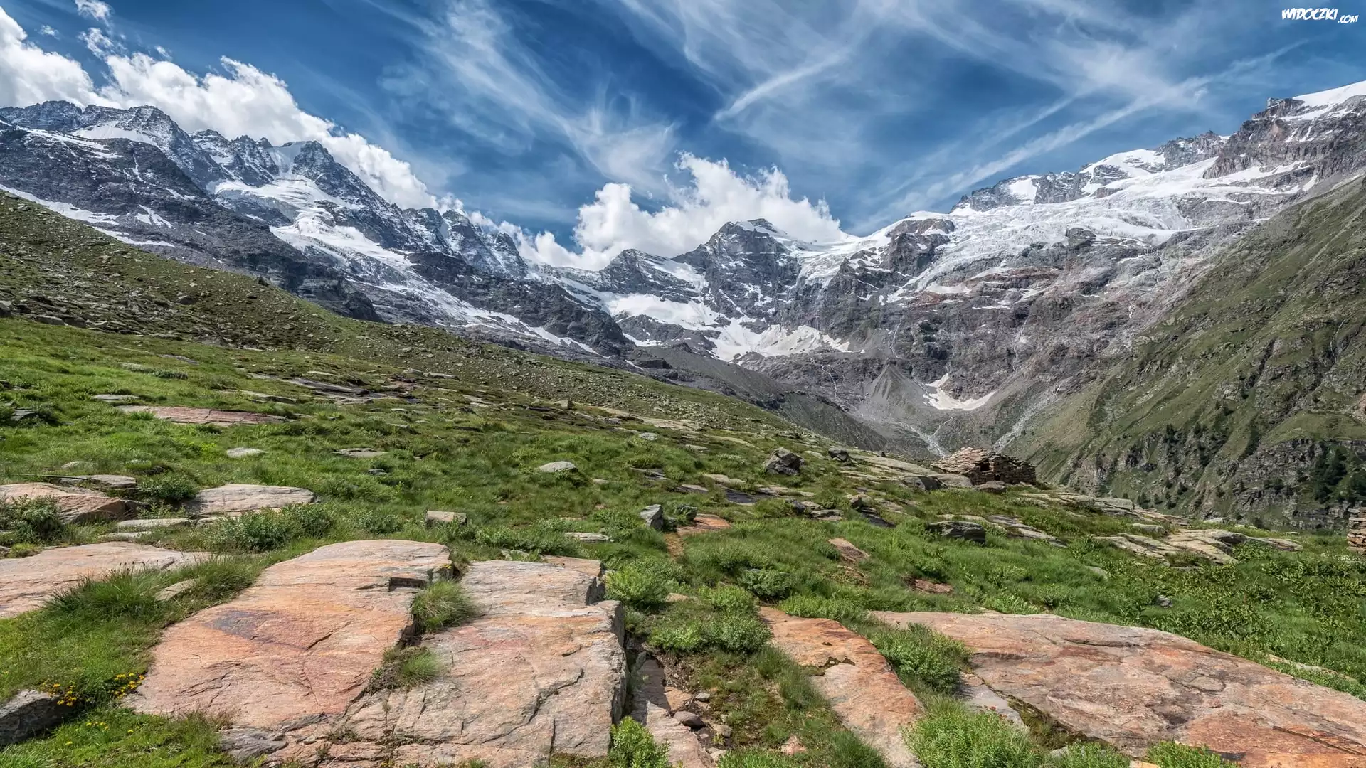 Góry, Śnieg, Dolina, Skały, Trawa