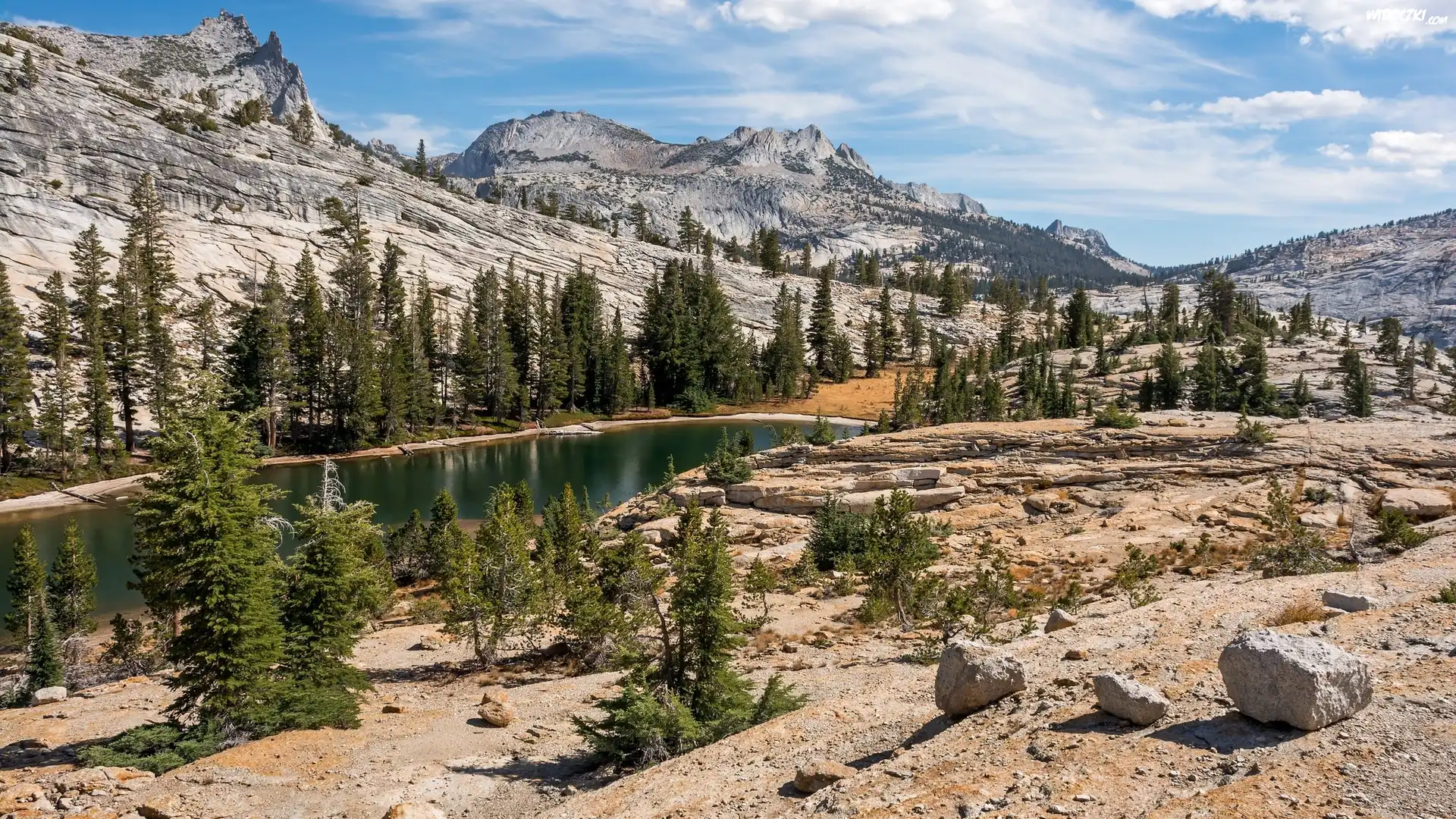 Zdjęcia, Góry, Drzewa, Jezioro, Kamienie, Skały, Chmury